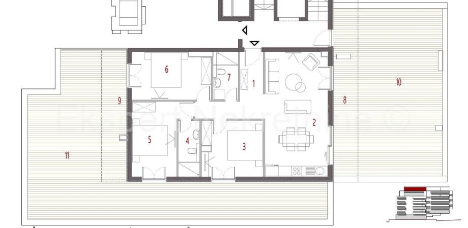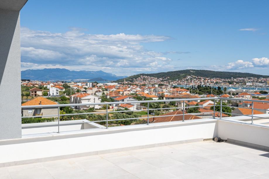 Seget Donji,dovršen penthouse 128 m2 ( 85 m2 stana plus 148 m2 terase) u novogradnji sa liftom i zajedničkim bazenom te garažom.Stan se nalazi na četvrtom (zadnjem) katu, a sastoji se od tri spavaće sobe, dvije kupaonice,kuhinje sa blagovaonicom i dnevnim boravkom te velike terase (148 m2) sa koje ima panoramski pogled na more.Stan je orijentiran istok-jug-sjeve-zapad.Stanu pripada i jedno garažno parking mjesto te jedno vanjsko parking mjesto kao i dvije ostave jedna 7.62 m2 a druga 2.85 m2.Zgrada je dovršena i odmah useljiva,te ima svu urednu dokumentaciju kao i vlasnički list. Kvalitetna gradnja(PVC stolarija,klima,podno grijanje,kvalitetna keramika itd.).Zgrada je udaljena svega 230 m od mora i plaže.Mogućnost kupnje na kredit.Cijena na upit .