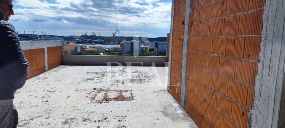 trenutno su završeni grubi građevinski radovi te budući kupac još može izabrati podne obloge a u cijenu je uključeno podno grijanje u kupaoni, dnevnom boravku te klima uređaj . Stan je jugo-istočne orijentacije te sa logge se pruža pogled na more i staru jezgru grada Trogira dok sa krovne terase je otvoren pogled.