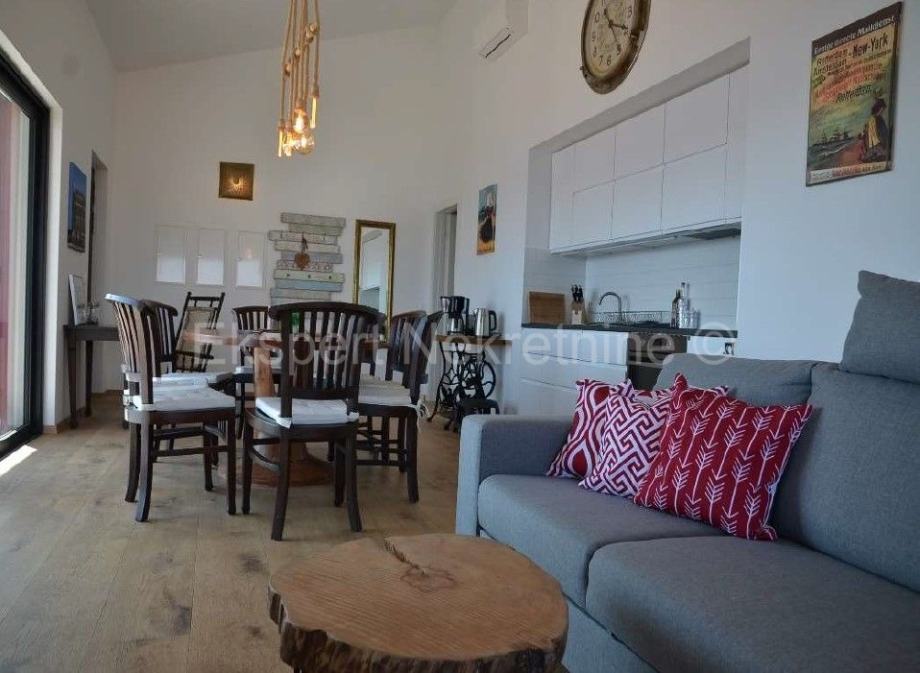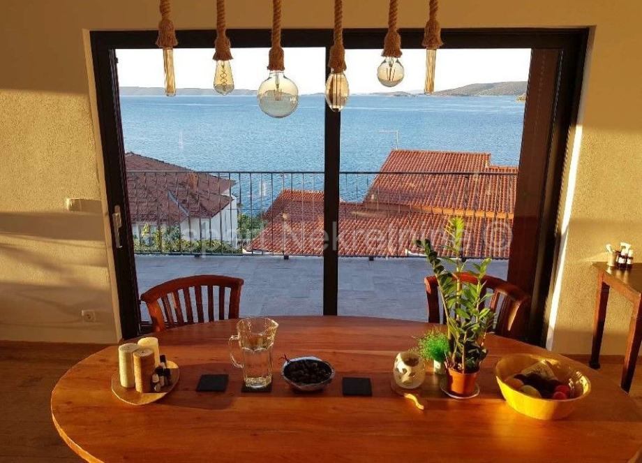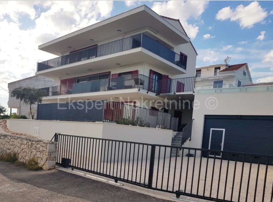 Seget Vranjica penthouse 95 m2 u zgradi samo samo 3 stana,novije gradnje(2020.g) sa otvorenim pogledom na more i otoke od kojeg je stan udaljen samo 60 metara.Stan ima dvije velike spavaće sobe,dva kupatila,kuhinju sa blagovaonicom i velikim dnevnim boravkom iz kojeg se izlazi na veliki balkon (41 m2) sa kojeg se pruža lijep i neometan pogled na more i otoke.Stan je kompletno namješten i takav se i prodaje.Pripada mu jedno vanjsko parking mjesto.Stan ima pravo korištenja bazena te prostora za skladište u velikoj garaži.