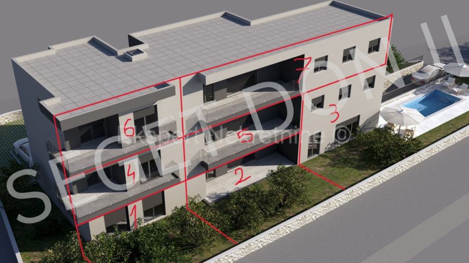 Seget Vranjica,troetažan 4-soban stan 164 m2 (100m2 stan+37m2 garaža+16m2 ostava+23 m2 bazen) + veliki vrt (290 m2) u novogradnji.Orijentacija stana je sjever-jug-istok.Stan se nalazi na dvije etaže,te ima garažu i ostavu u podrumu ispod stana.Na prizemnoj etaži se nalaze spavaća soba,kupaonica,hodnik,kuhinja,blagovaonica i dnevni boravak,unutarnje stubište,dok se na gornjoj etaži nalaze tri spavaće sobe,od kojih jedna sa vlastitim kupatilom,i jedno zajedničko kupatilo te hodnik i stubište. Stanu pripada i veliki vrt od cca 290 m2,u kojem se nalazi bazen (23m2),te prilaz u garažu te parking mjesto.Obzirom na veličinu stana te veliki vrt sa bazenom kao i garaža i ostava u podrumu koji su povezani unutarnjim stubištem ovaj stan pruža dojam kao da živite u obiteljskoj kući.
