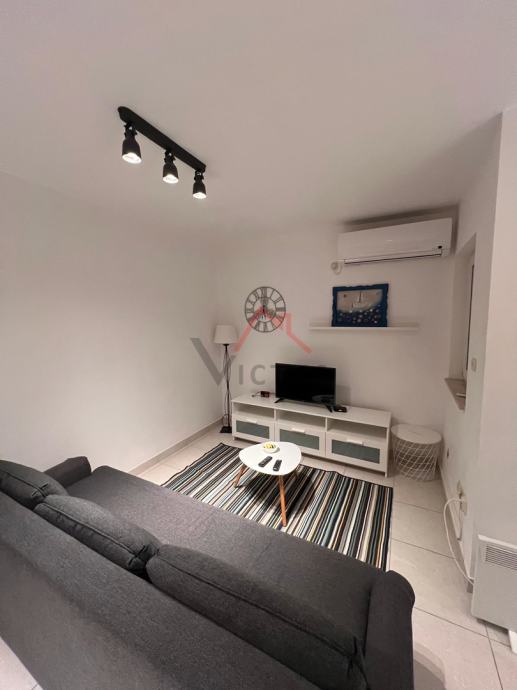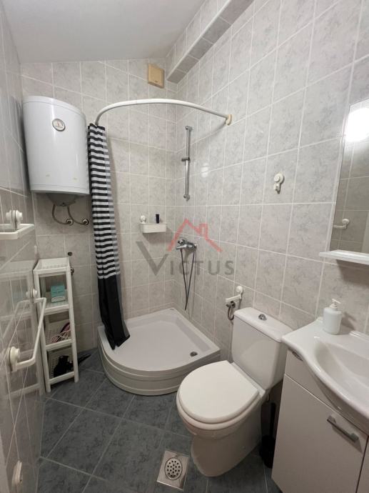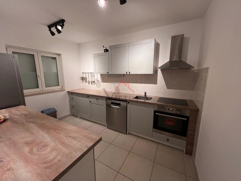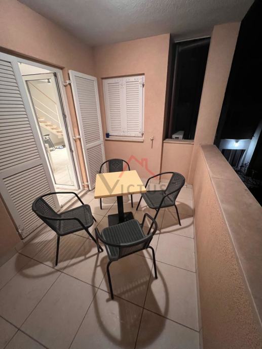Na donjoj etaži se nalazi dnevni boravak, kuhinja, blagovaonica, kupaonica i lođa s koje se pruža djelomičan pogled na more, dok se u potkrovlju nalaze dvije spavaće sobe i kupaonica. Stan je klimatiziran, s postavljenom PVC stolarijom, te se prodaje potpuno namješten.