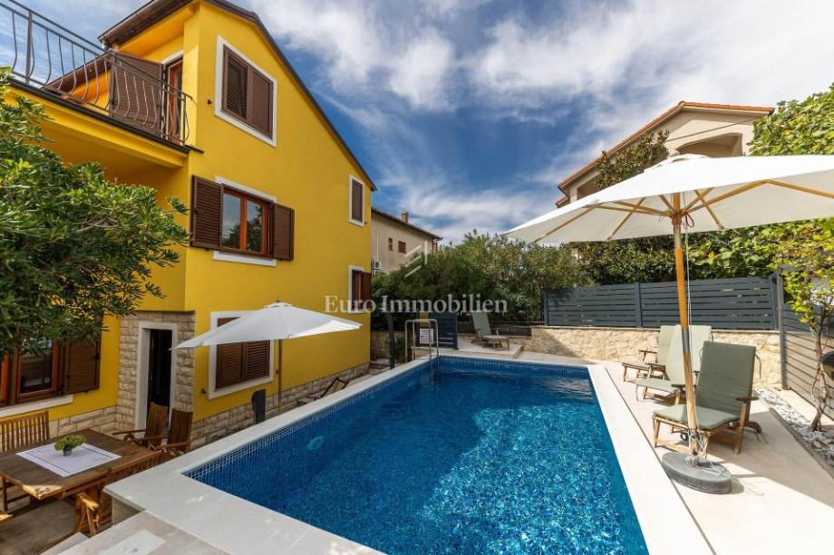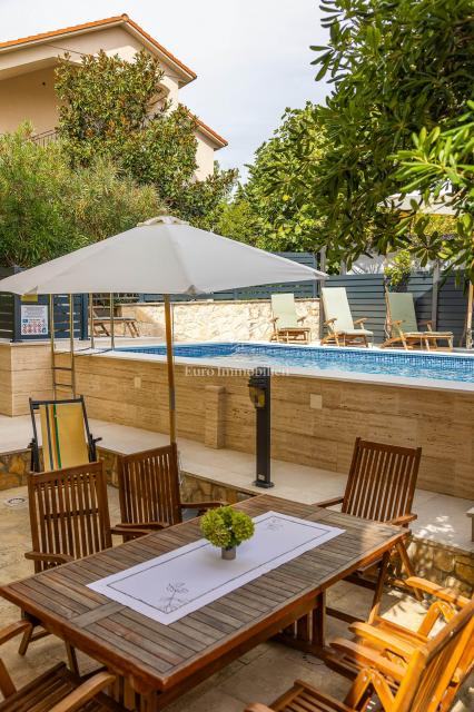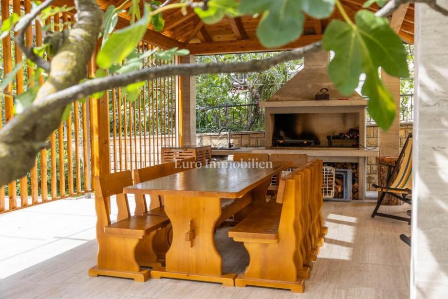 U središnjem dijelu dvorišta smješten je grijani bazen, dok se na prednjem dijelu nalazi velika sjenica s roštiljem i prostorom za druženje.