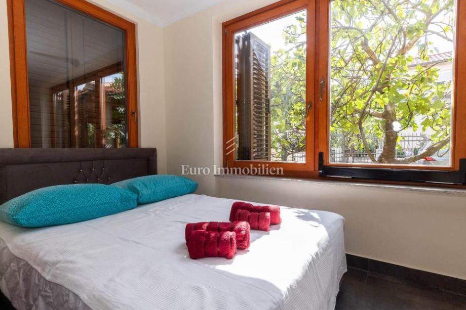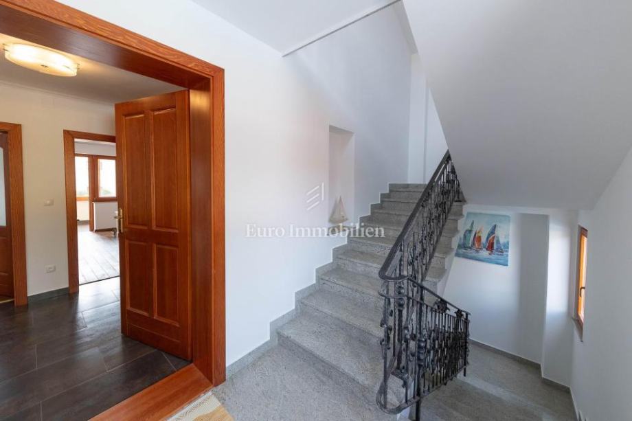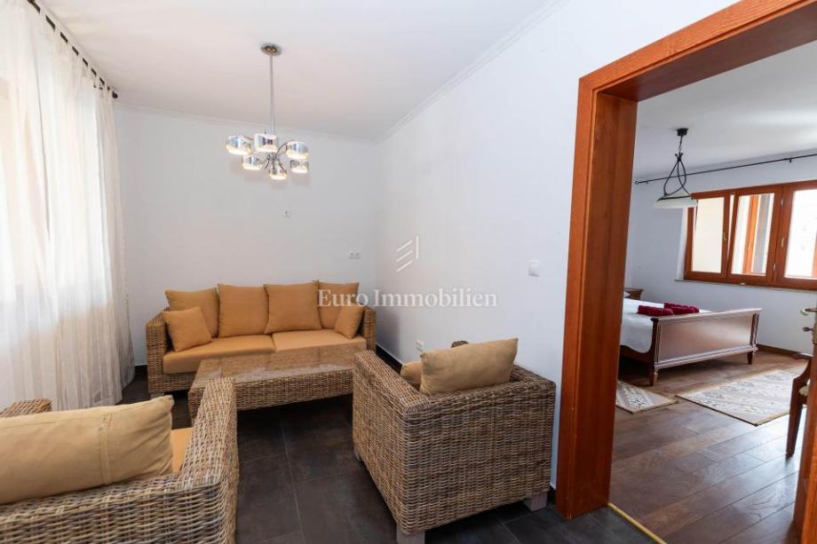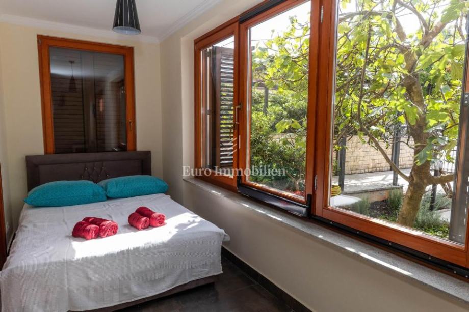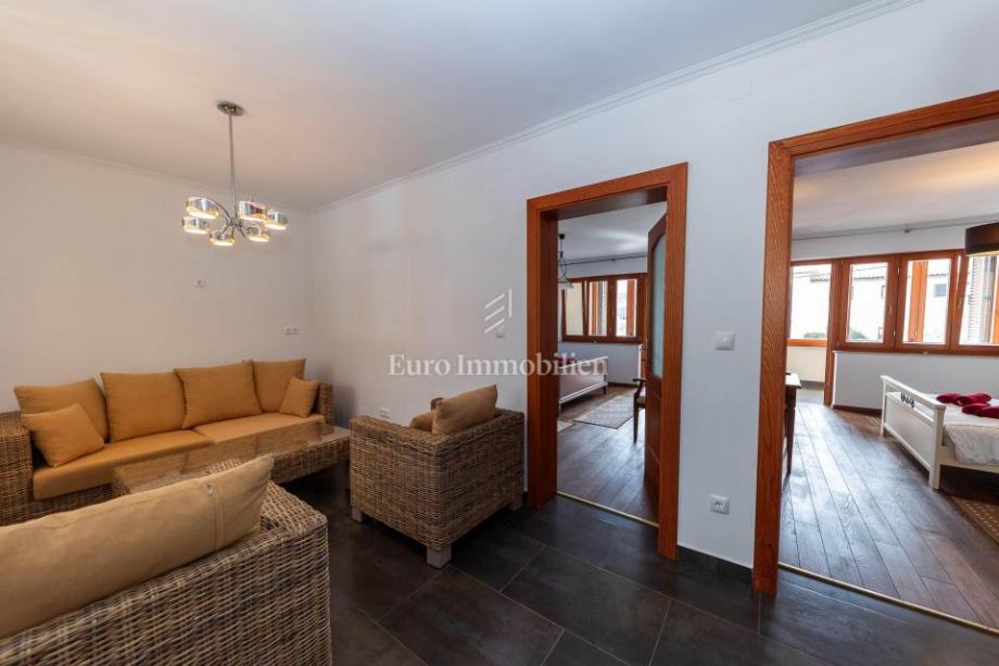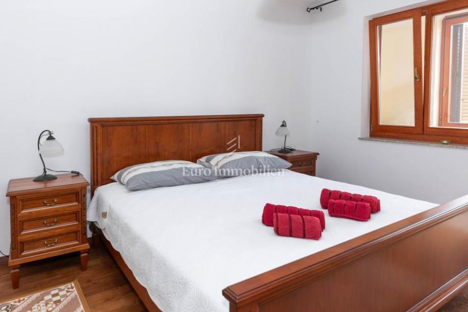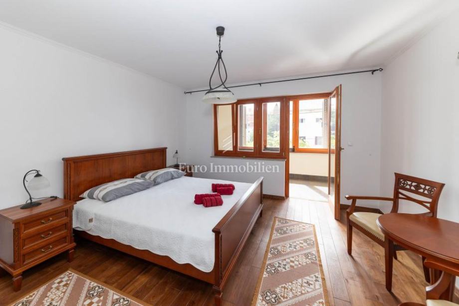 Veća kuća sastoji se od tri etaže. Na prve dvije etaže nalaze se komforni dvosobni stanovi, dok je u potkrovlju smješten iznimno prostran studio apartman s dva balkona. Kuća je potpuno opremljena i namještena visokokvalitetnim namještajem te se kao takva i prodaje. Posebnu vrijednost daju masivni parketi od tikovine, stolarija od ariša s aluminijskim griljama, reprezentativno granitno stubište te keramika renomiranih proizvođača. Unutarnje stubište sa zasebnim ulazima omogućuje etažiranje na samostalne stambene jedinice.