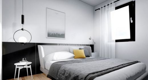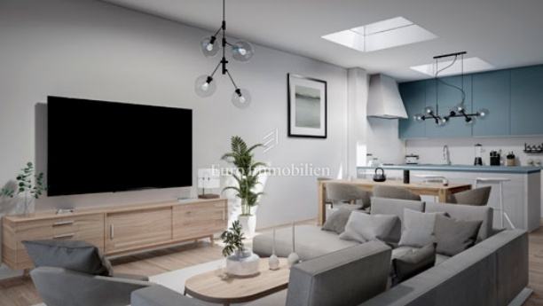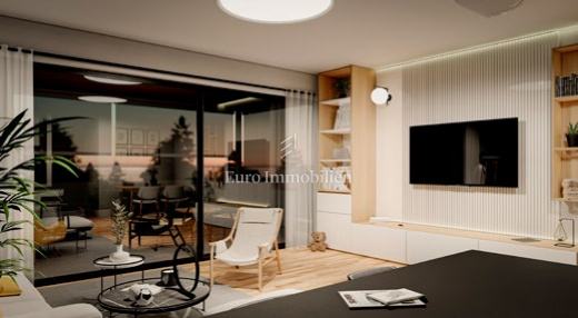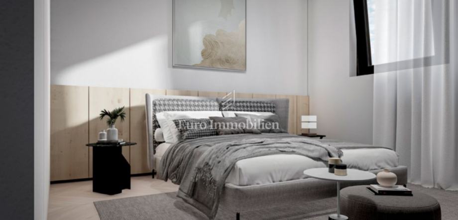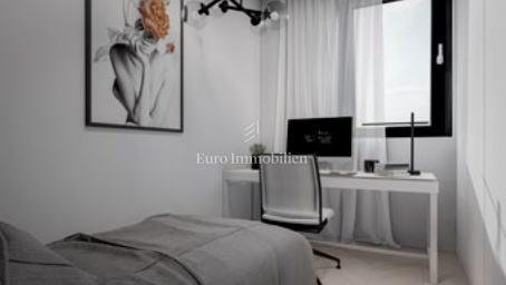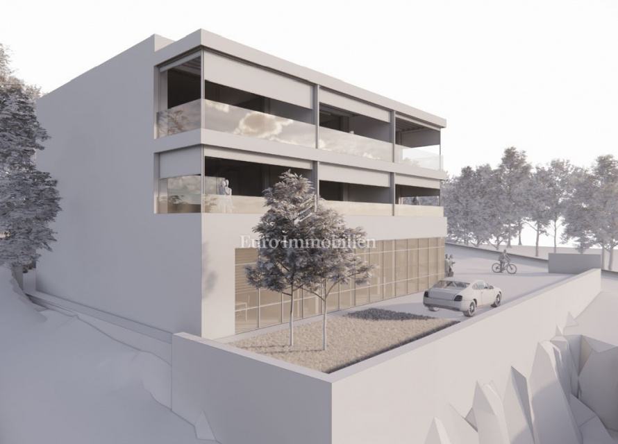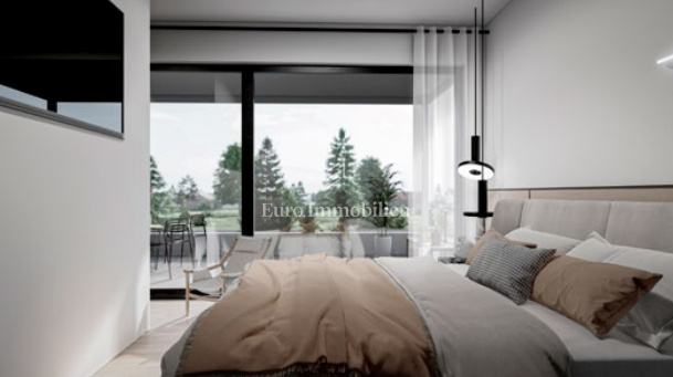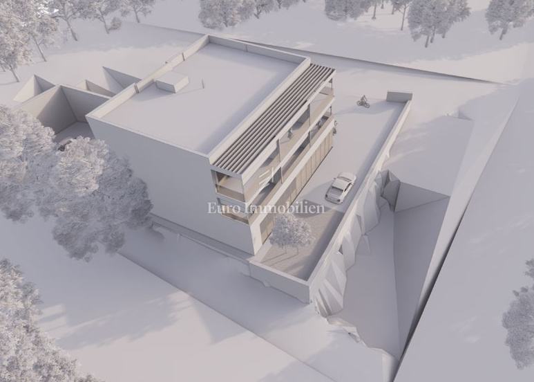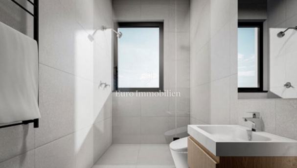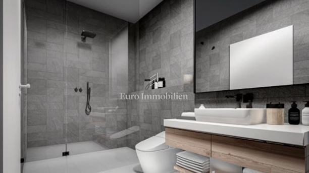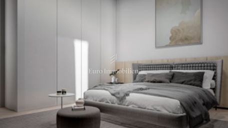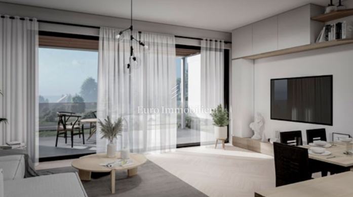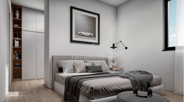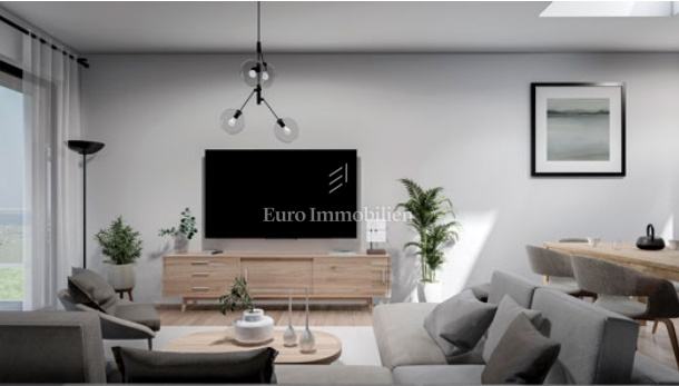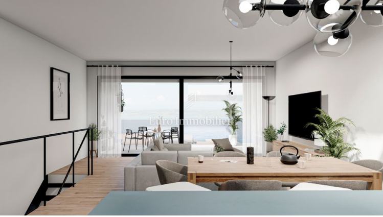 Na prodaju je luksuzni dvoetažni stan s liftom i prekrasnim pogledom na more. Na prvom katu nalaze se dvije spavaće sobe od kojih jedna ima balkon s pogledom na more. Unutarnjim stepenicama ili liftom se dolazi na drugi kat gdje se nalazi hodnik, kupaonica, spavaća soba, kuhinja s blagovaonom i dnevni boravak koji ima izlaz na balkon s kojeg se pruža pogled na more i mjesto. Stanu pripadaju dva parkirna mjesta, a napravljena je i priprema za električnu punionicu za automobile. Nekretnina je opremljena alarmom, video nadzorom, satelitskom antenom, dizalicom topline za podno grijanje, a svaka prostorija ima klima uređaj. U svim prostorijama je postavljen parket dok je u kupaonicama postavljena keramika. Vanjska stolarija je aluminijska sa sjenilima, komarnicima i roletama na struju, a unutarnja je drvena. U ovoj fazi gradnje postoji mogućnost biranja materijala.