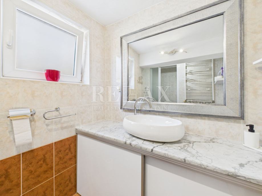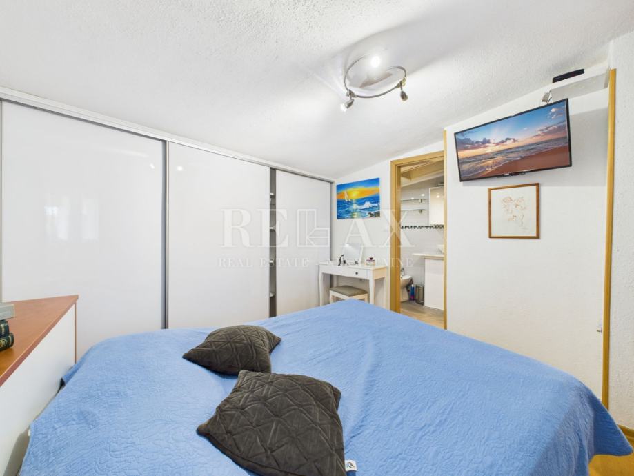 Na drugom katu nalaze se dvije spavaće sobe s ugradbenim ormarima, od kojih jedna ima izlaz na balkon s pogledom na more. Na ovoj etaži nalazi se i treća kupaonica. Sve sobe su klimatizirane, a kuća ima centralno grijanje u svim prostorijama, što omogućuje ugodan boravak tijekom cijele godine.