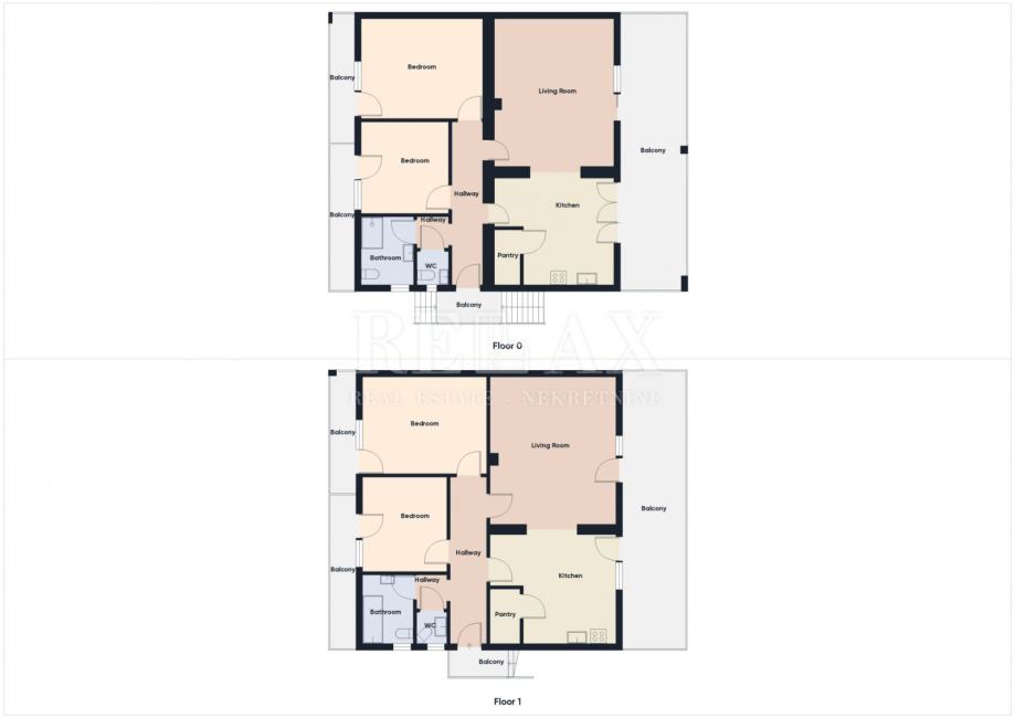 Kuća se sastoji od dva zasebna stana, svaki s dvije prostrane spavaće sobe, moderno opremljenom kupaonicom, dodatnim odvojenim WC-om, potpuno funkcionalnom kuhinjom te velikim dnevnim boravkom koji pruža osjećaj prostranosti i topline. Svaki stan izlazi na prostranu terasu s koje se pruža ugodan pogled. Parkirna mjesta su osigurana za svaki stan, čime se dodatno doprinosi praktičnosti svakodnevnog života.