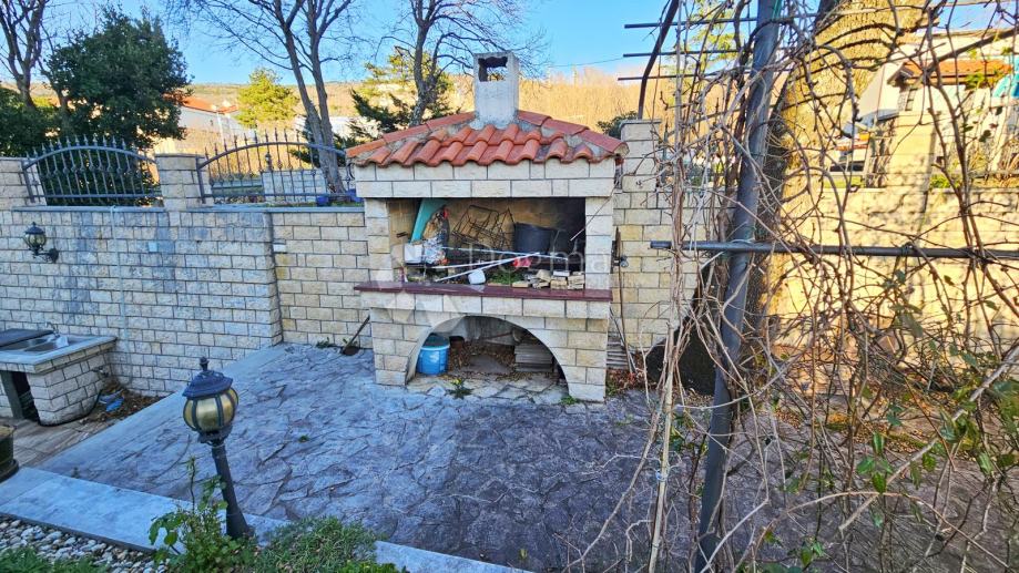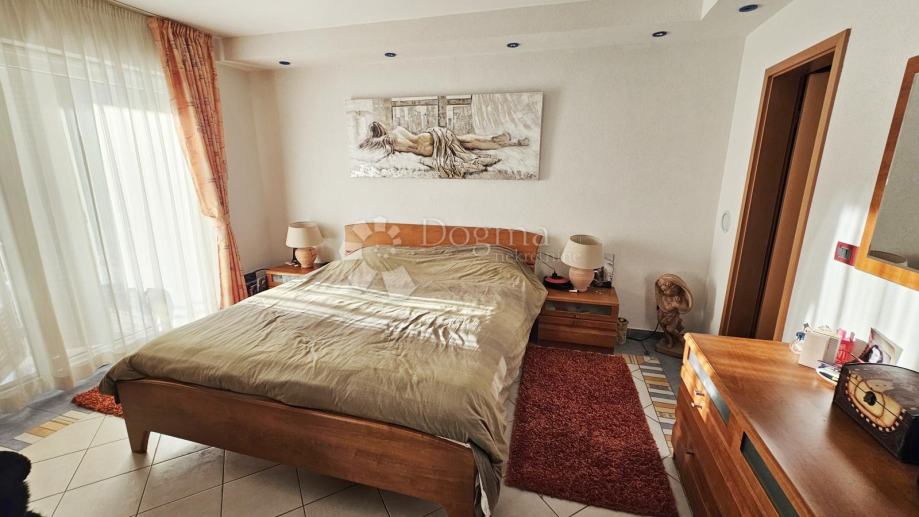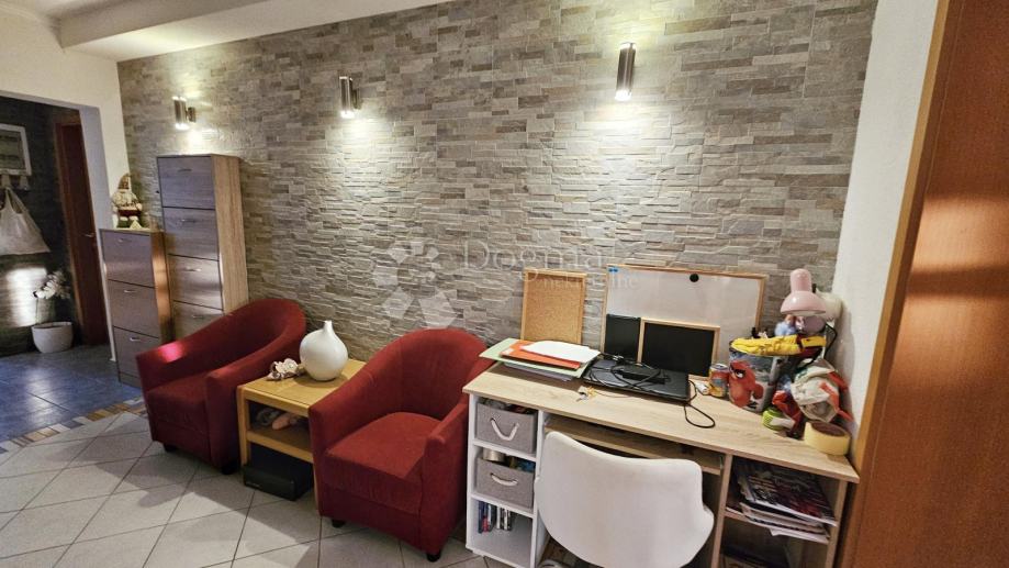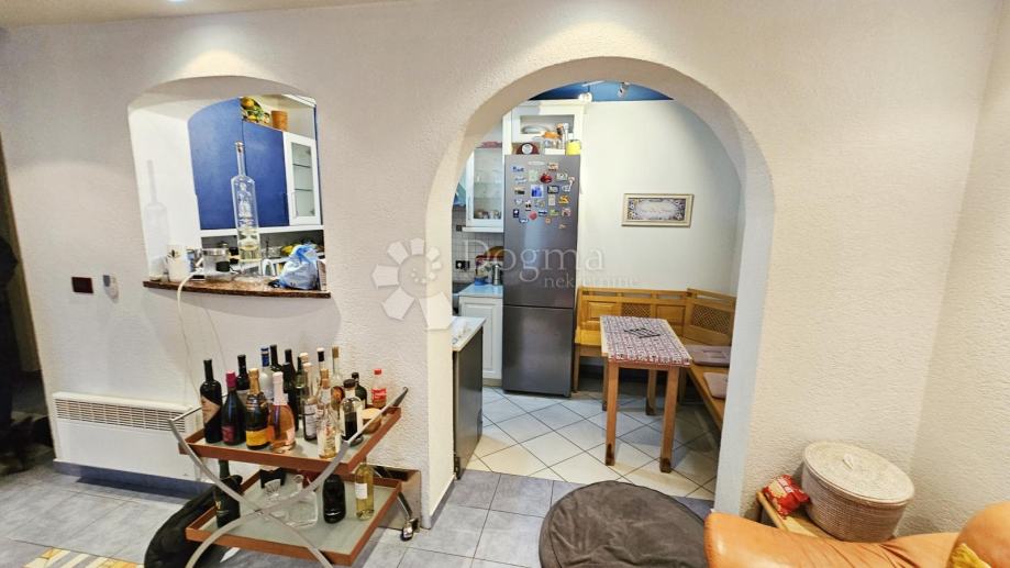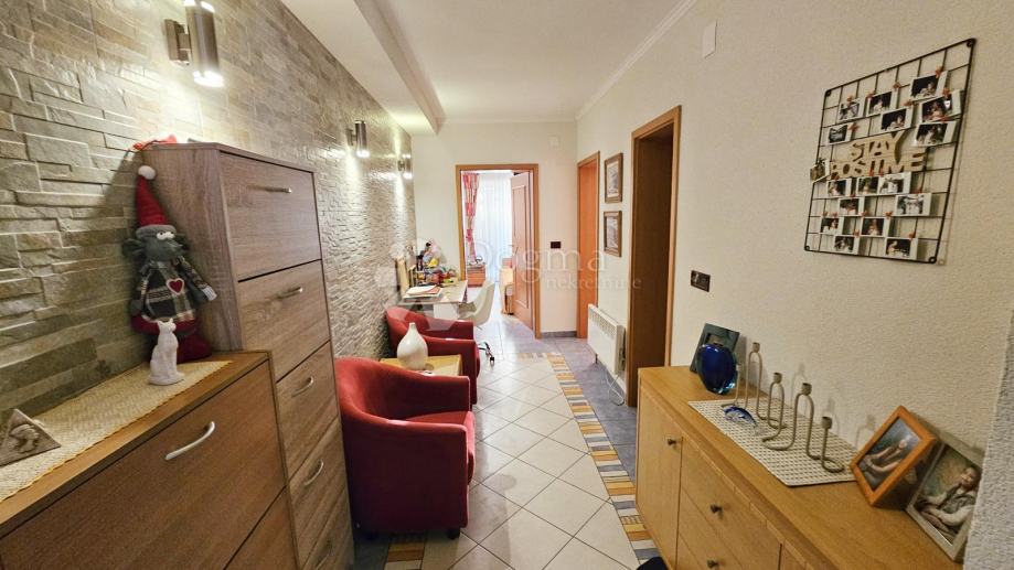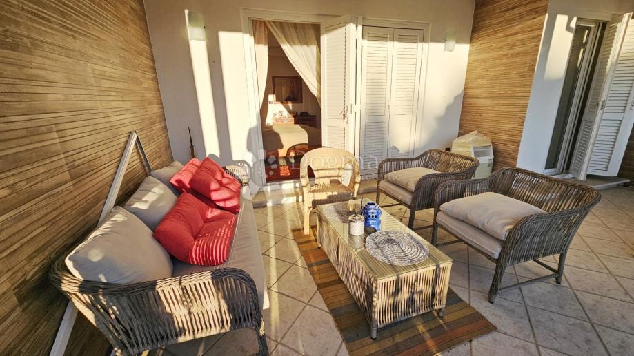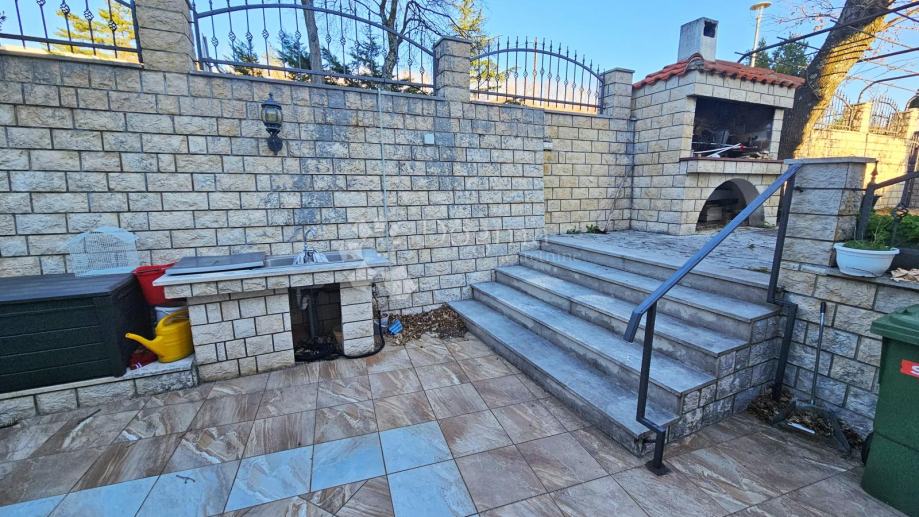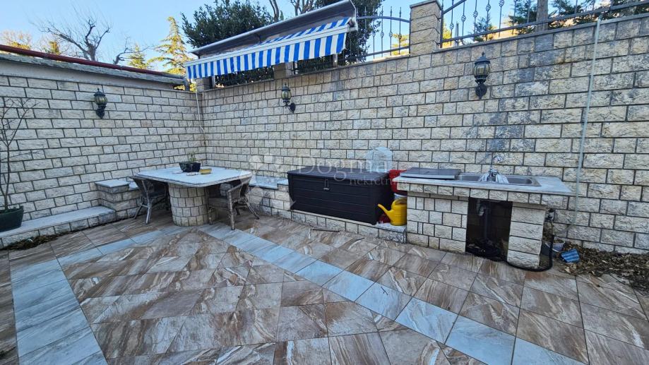 Stan se prostire na funkcionalno raspoređenih **dvije spavaće sobe, dvije kupaonice, prostrani dnevni boravak s kuhinjom u open space konceptu, spremište i predivnu loggiu**. Dodatni adut nekretnine je **vanjska popločena terasa s kaminom** te **vrt prepun mediteranskog bilja i voćaka**, ograđen lijepom kovanom ogradom, pružajući privatnost i opuštajući ambijent.
