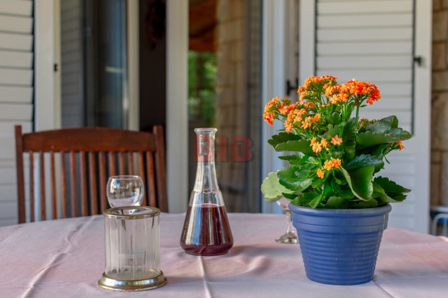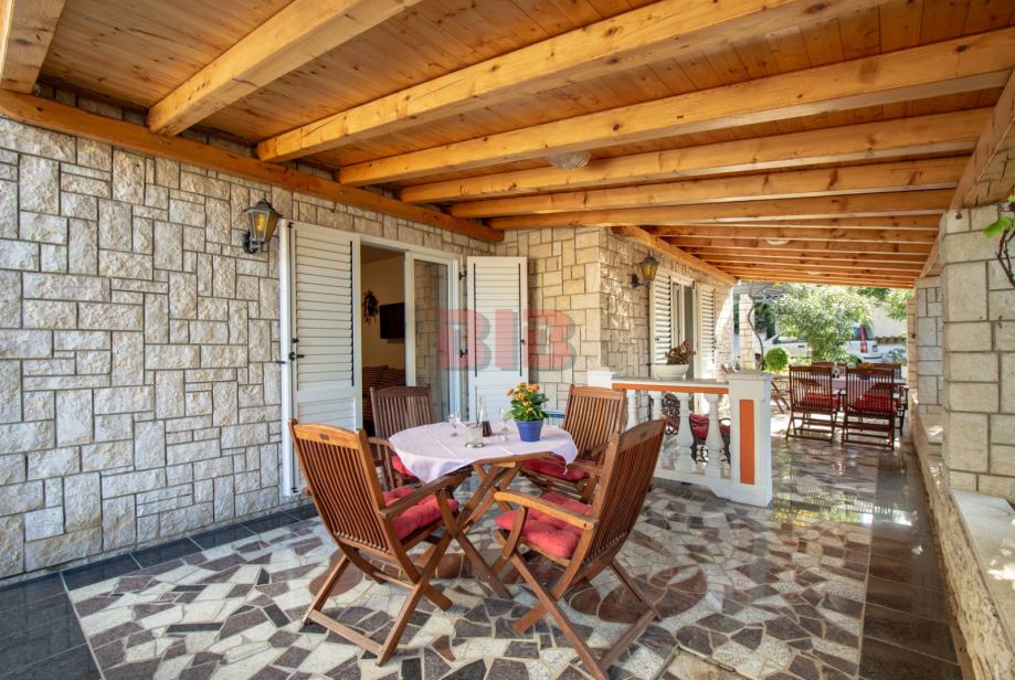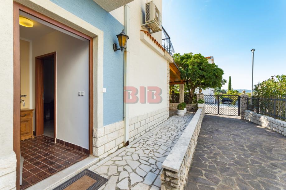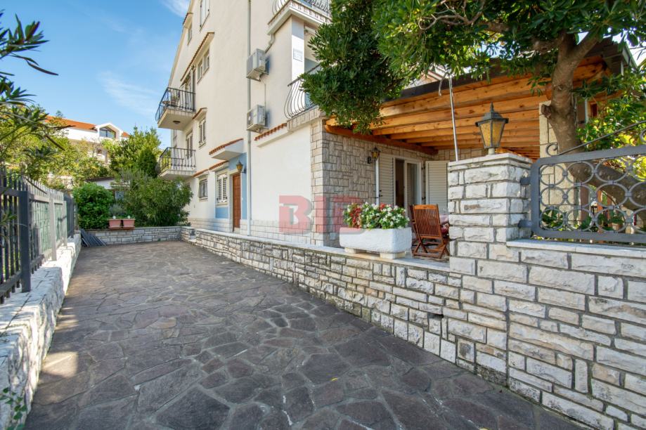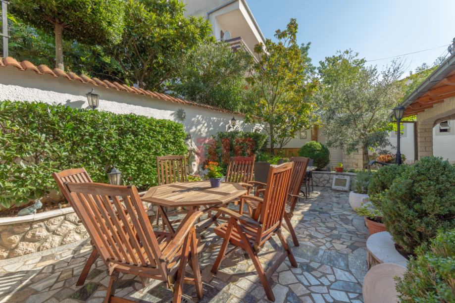 Okućnica vrlo lijepo uređena na kojoj se nalazi ljetna kuhinja sa terasom,spremište,dopla garaža,te parking za više automobila