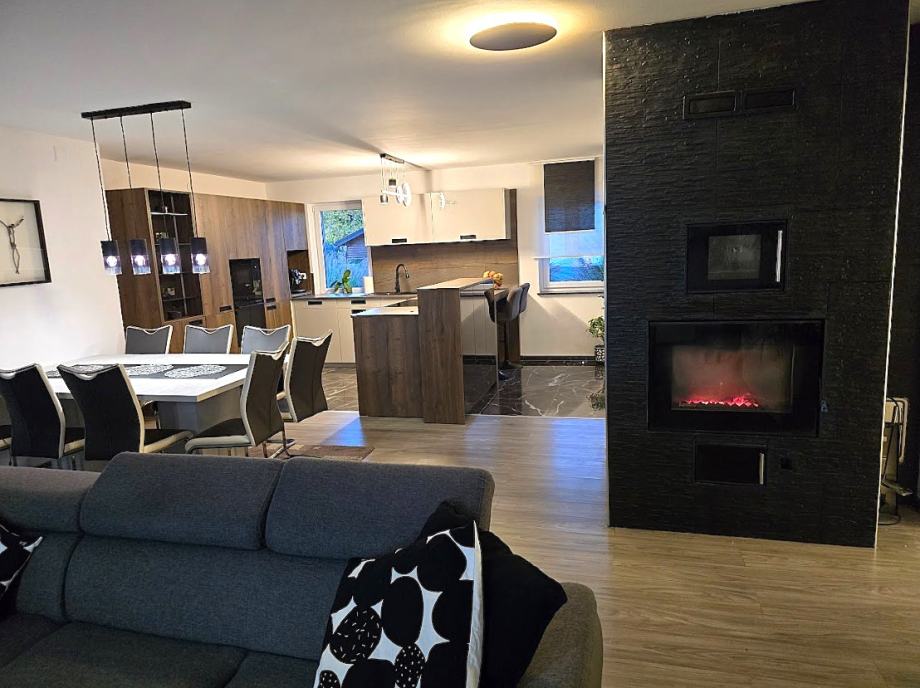 - kuća je termo izolirana i ima automatizirano dualno grijanje na plinski kondenzacijski bojler i na kamin na kruta goriva, grijanje je podno u cijeloj kući,