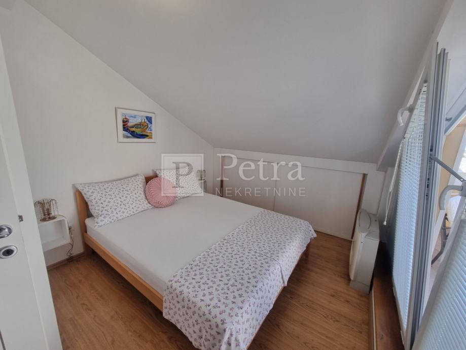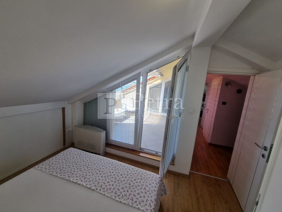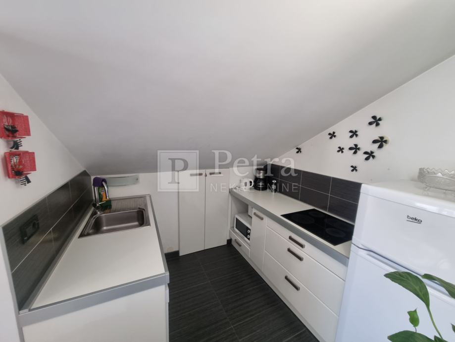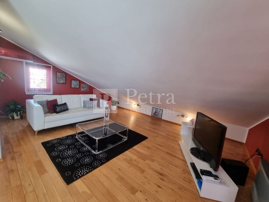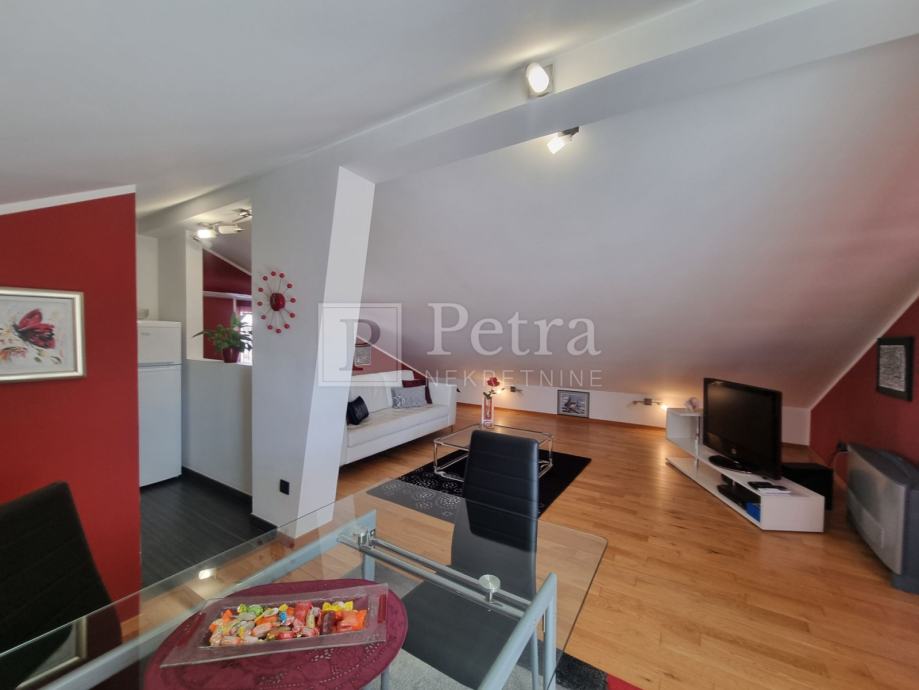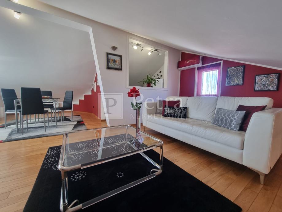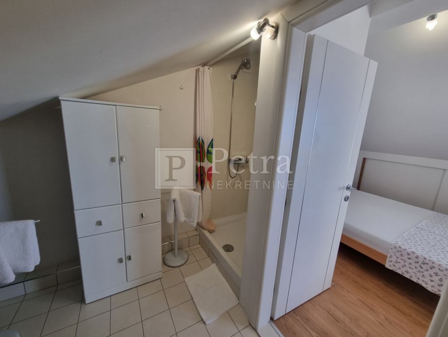 Lijepo uređen stan u potkrovlju koji se proteže duž cijele etaže koja u naravi ima 70 m2. Sastoji se od dnevnog boravka, blagovaone, kuhinje, spavaće sobe s kupaonicom, toaleta, te terase s pgledom na more i kulu Nehaj. Prodaje se namješten. Nalazi se u mirnoj ulici. Ulaz je sa stražnje strane kuće i parkirno mjesto.