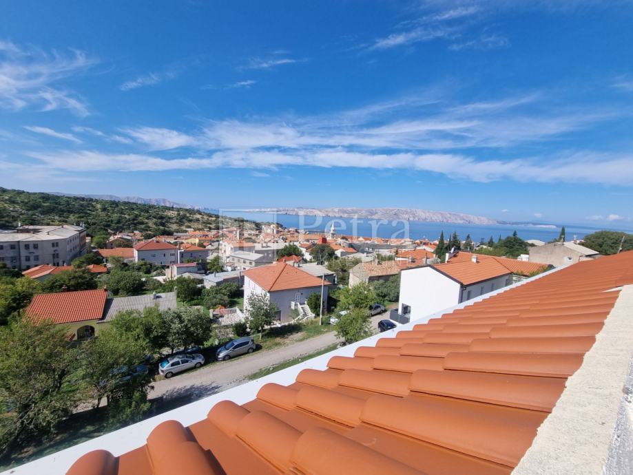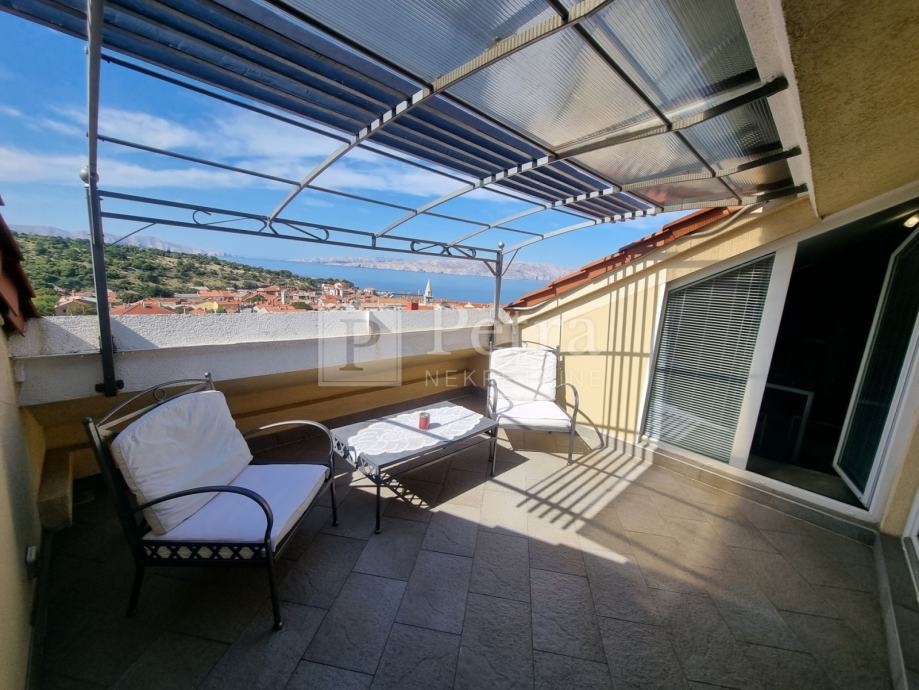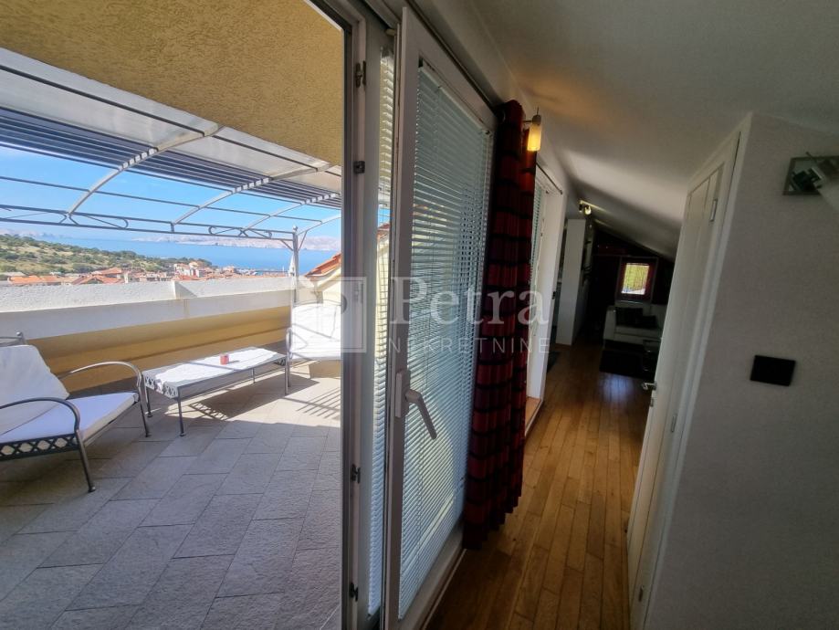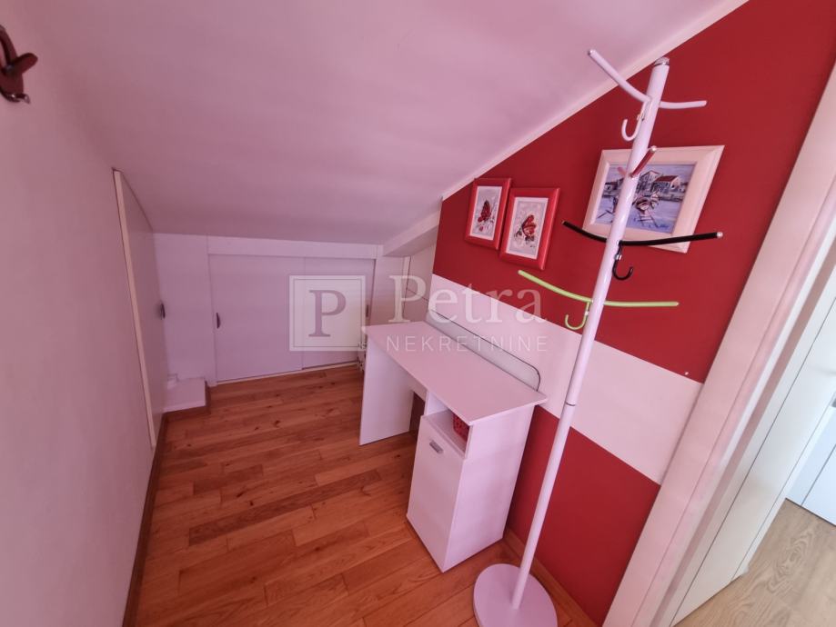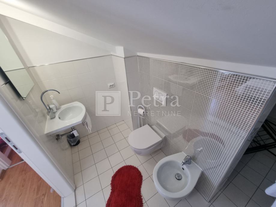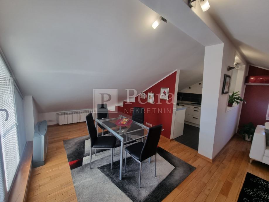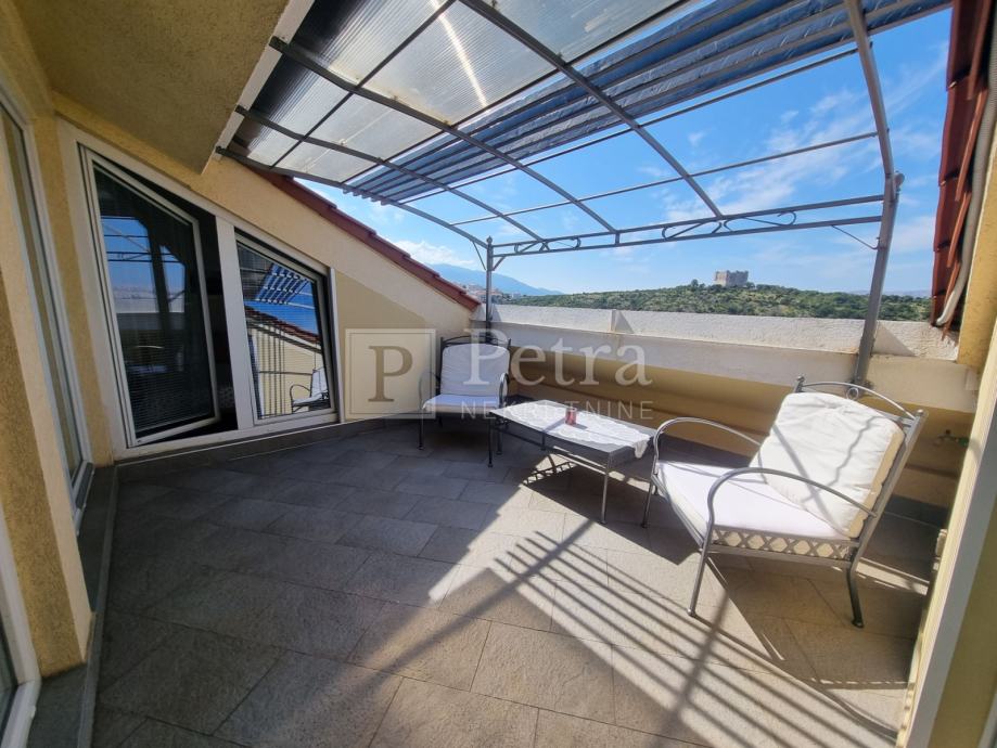 Lijepo uređen stan u potkrovlju koji se proteže duž cijele etaže koja u naravi ima 70 m2. Sastoji se od dnevnog boravka, blagovaone, kuhinje, spavaće sobe s kupaonicom, toaleta, te terase s pgledom na more i kulu Nehaj. Prodaje se namješten. Nalazi se u mirnoj ulici. Ulaz je sa stražnje strane kuće i parkirno mjesto.