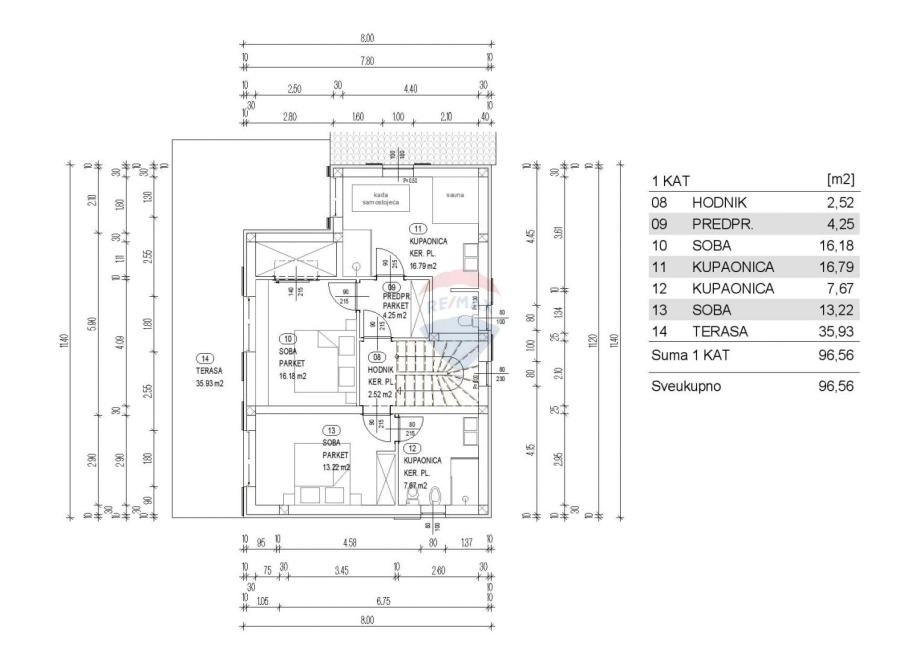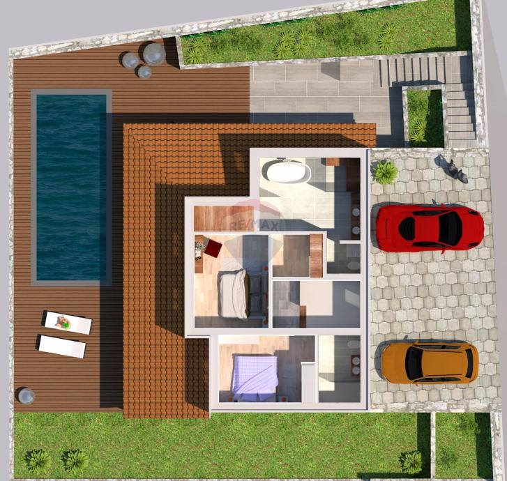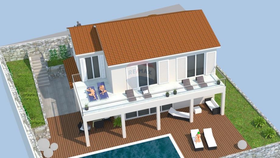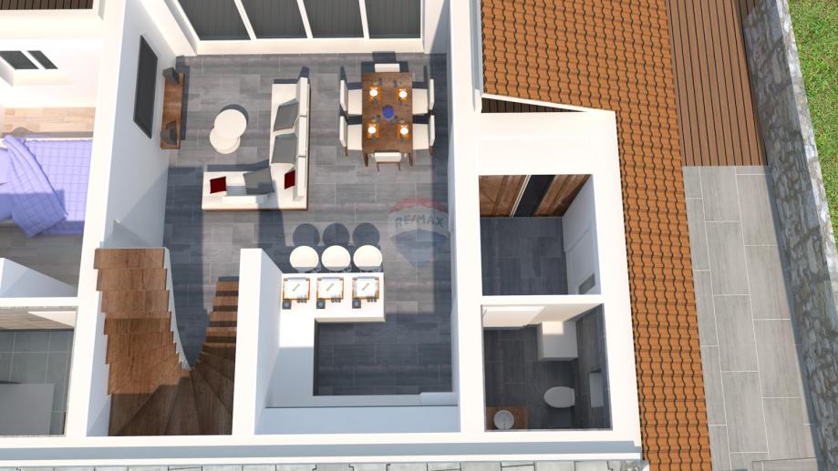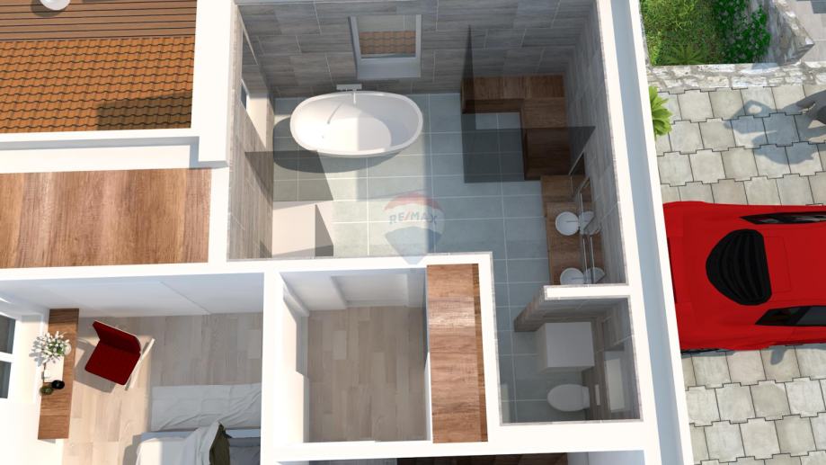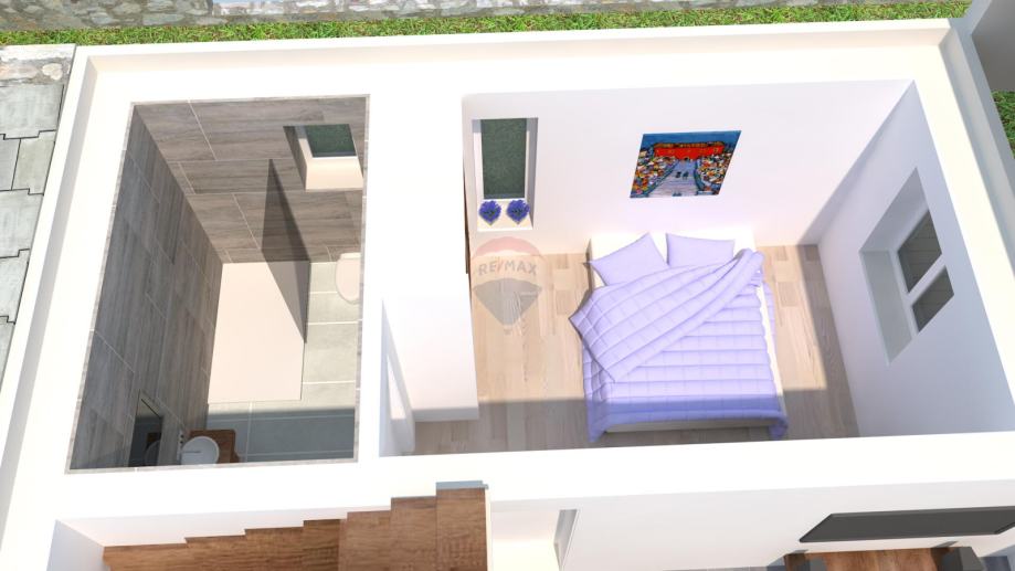 Unutarnje stubište povezuje prizemlje sa 1.katom kuće, gdje će se nalaziti dvije spavaće sobe i dvije kupaonice sa wc-om sa izlazom na nenatkrivenu terasu, sa koje se pruža prekrasan pogled na prirodu i more.