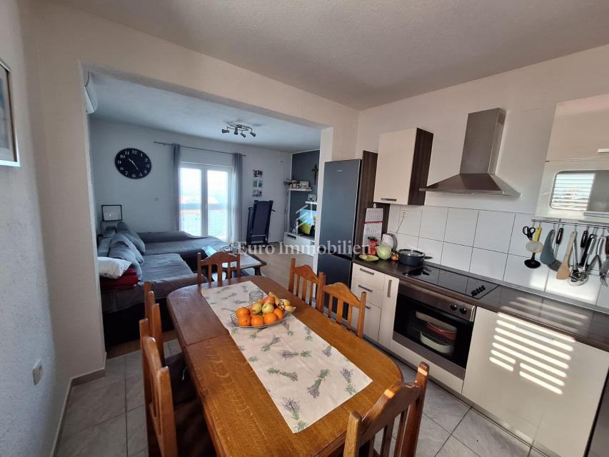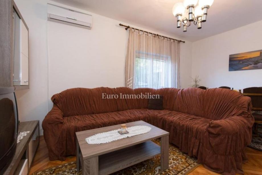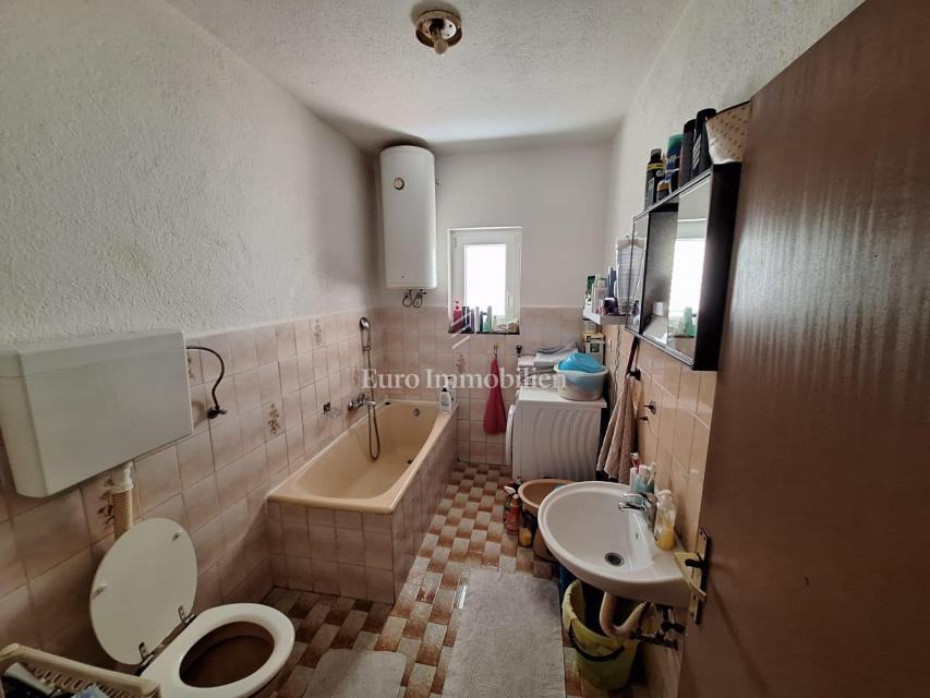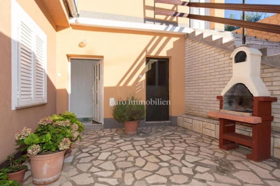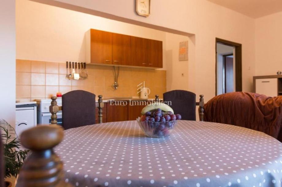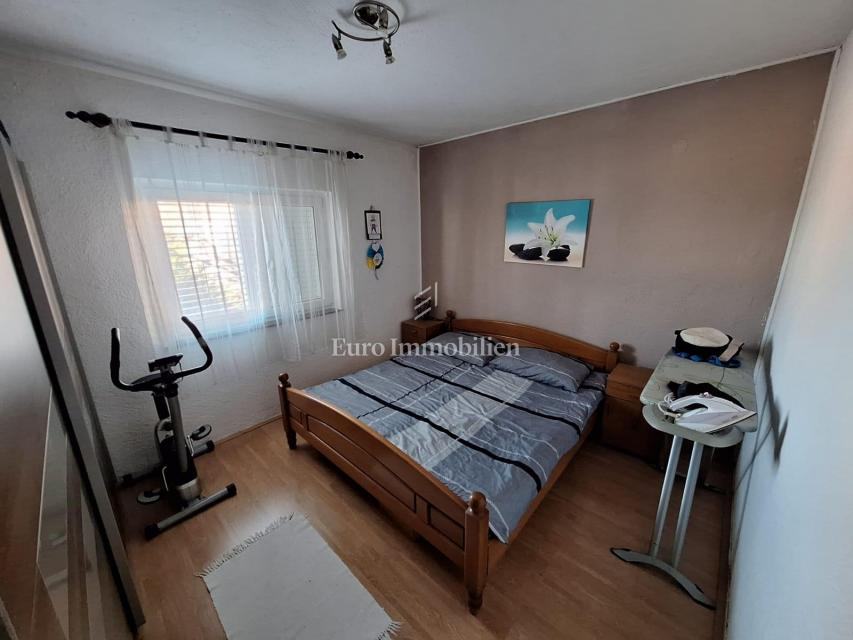 Prizemlje: stan s kuhinjom i dnevnim boravkom, dvije spavaće sobe, kupaonicom, terasom i drvarnicom.