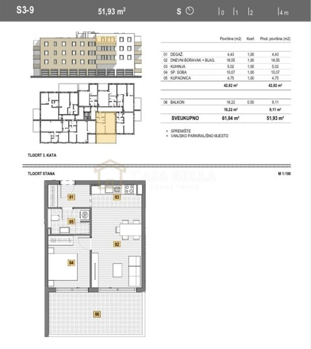 Objekt ima tri kata i ukupno 31 stan. U podrumu se nalaze spremišta, u prizemlju garaže, a uz zgradu vanjska parkirna mjesta.