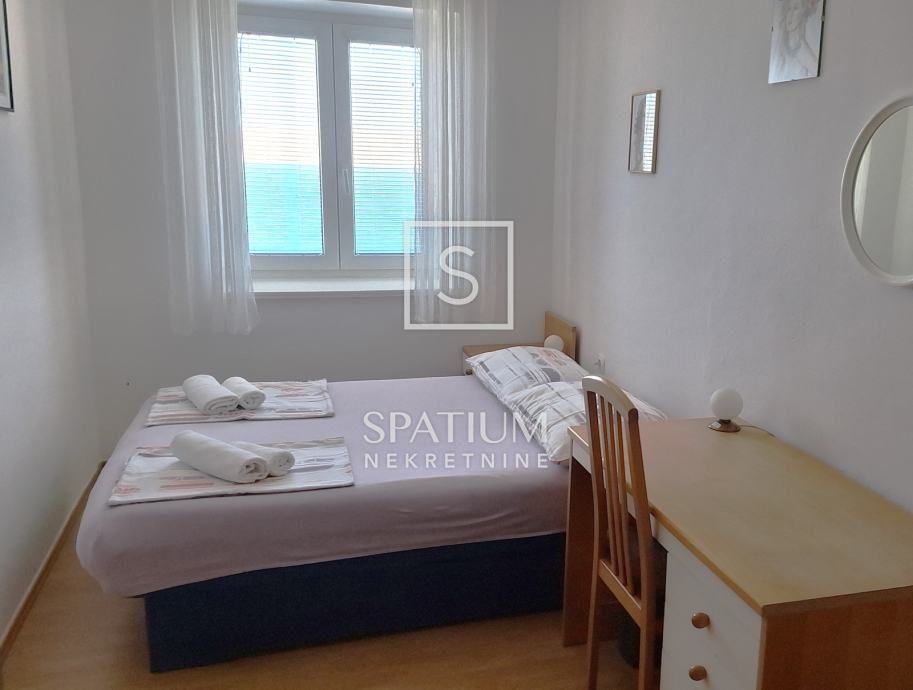 Sastoji se od ulaznog hodnika, kuhinje s blagovaonom, dnevnog boravka s izlazom na balkon, dvije spavaće sobe s pogledom na more, od kojih jedna ima izlaz na balkon, ostave i kupaone.