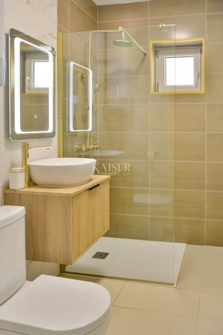 Kupaonica je moderno uređena, s walk-in tušem i kvalitetnim detaljima koji prostoru daju dozu elegancije.