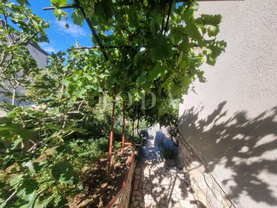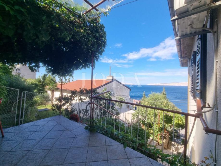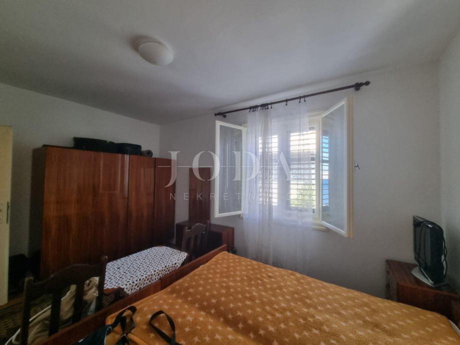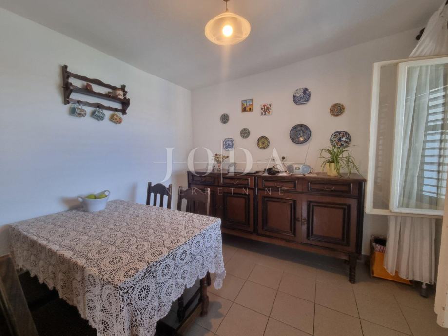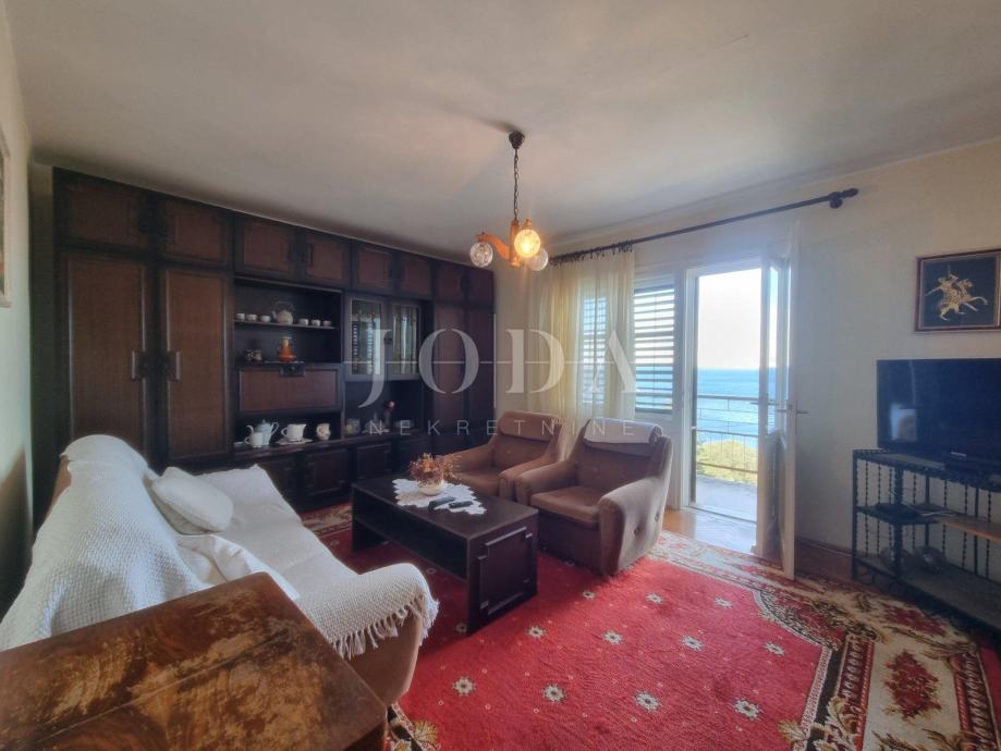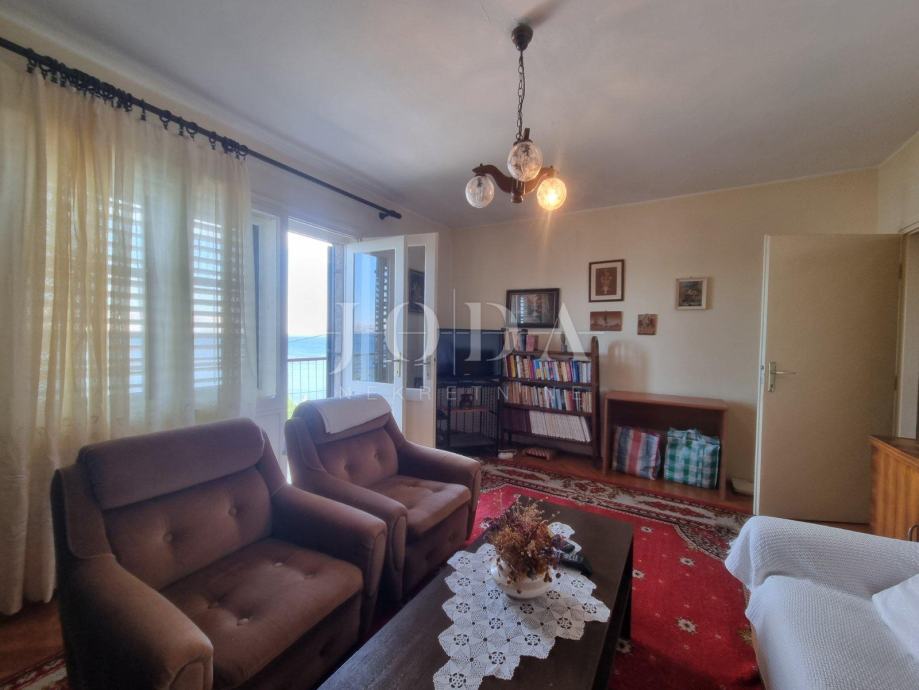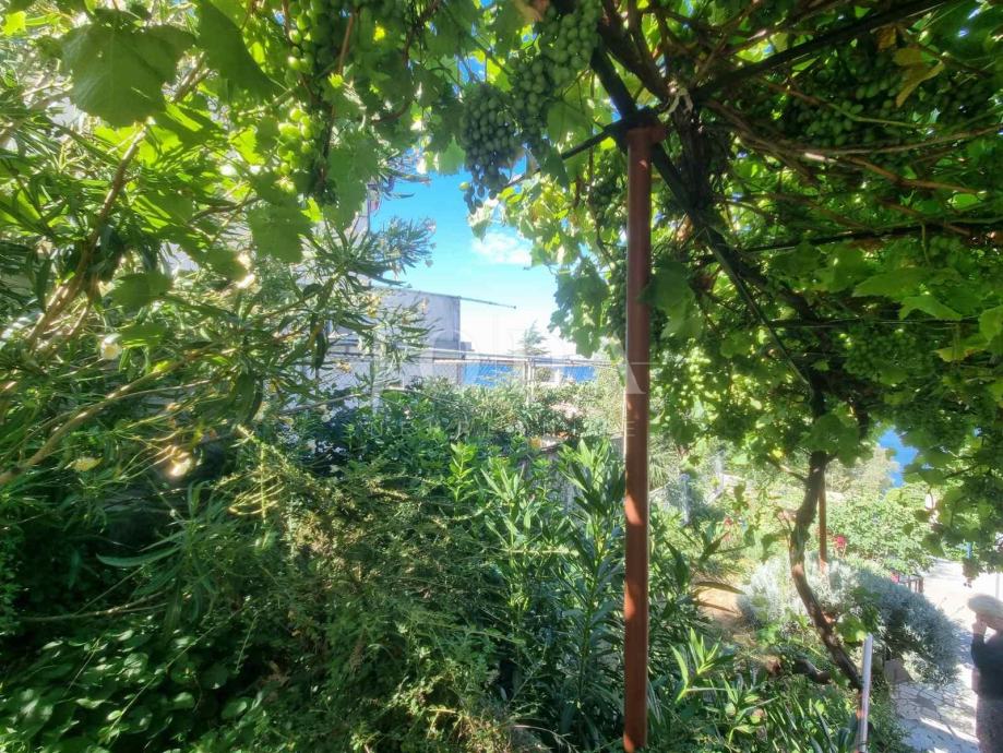 Prodajemo stan na prvom katu kuće na samo 75m od mora. Stan se sastoji od tri spavaće sobe, dnevnog boravka, kuhinje, blagovaone, hodnika, kupaoaone i balkona sa kojeg se pruža prekrasan pogled na more.Tavanski prostor ima ulaz direktno iz stana i može se koristiti kao dodatno spremište. U prizemlju kuće se nalazi terasa od 30m2, garaža i dva spremišta. Kaskadna okućnica zasađena je mediteranskim biljem, uređena i održavana. Nekretnina se nalazi na odličnoj lokaciji nedaleko od svih potrebnih sadržaja te ima veliki potencijal za uređenje prema osobnim potrebama i željama.