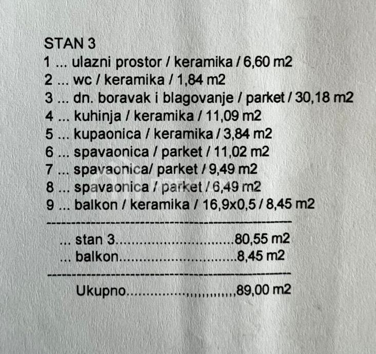 Stan ima prostrani balkon površine 8,45 m2 m2 koji je prava oaza za popodnevno opuštanje ili jutarnje upijanje prvih zraka sunca. Bruto površina nekretnine s parkirnim mjestima je 111 m2 m2 a obračunski 90,27 m2.