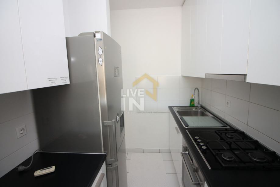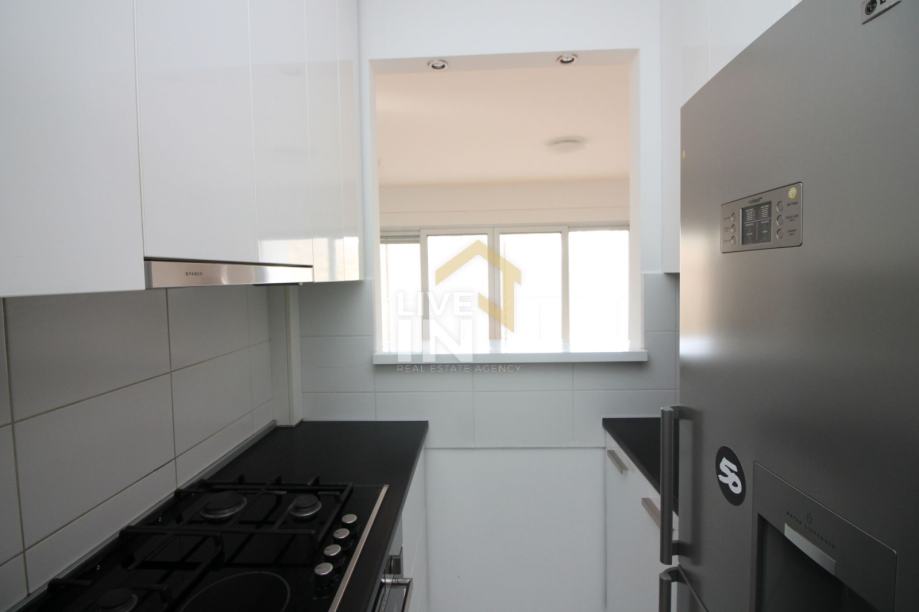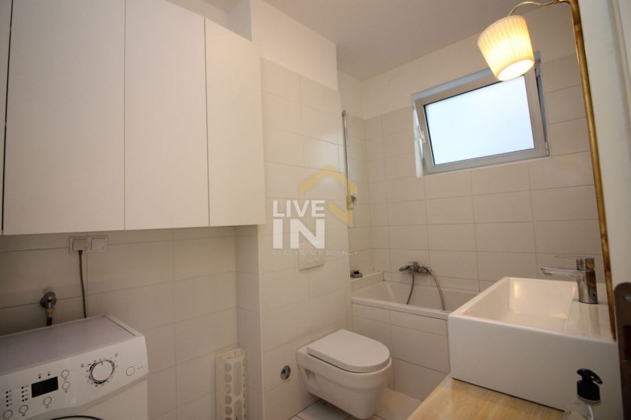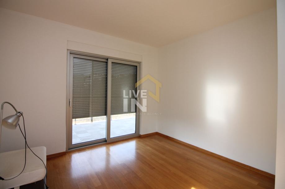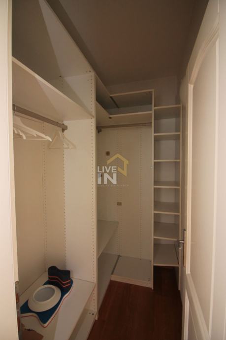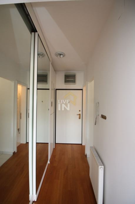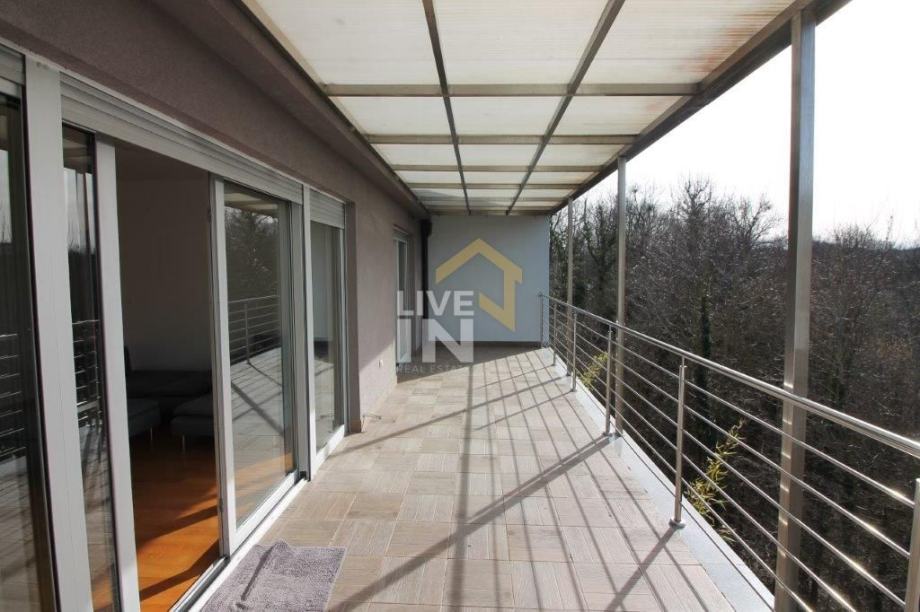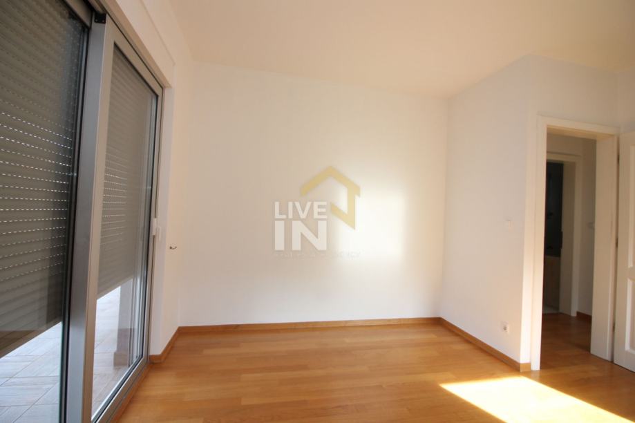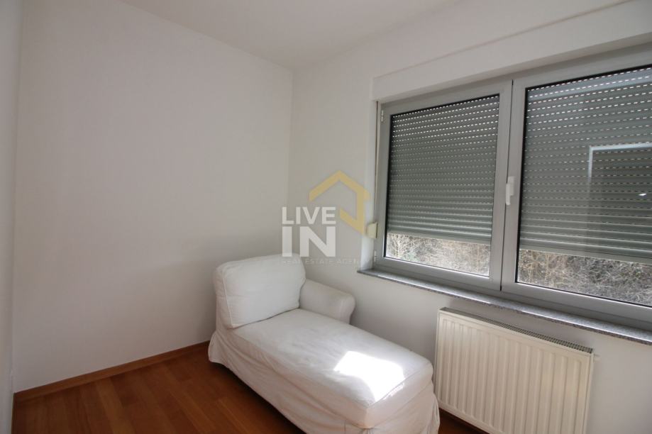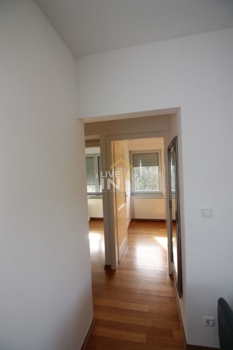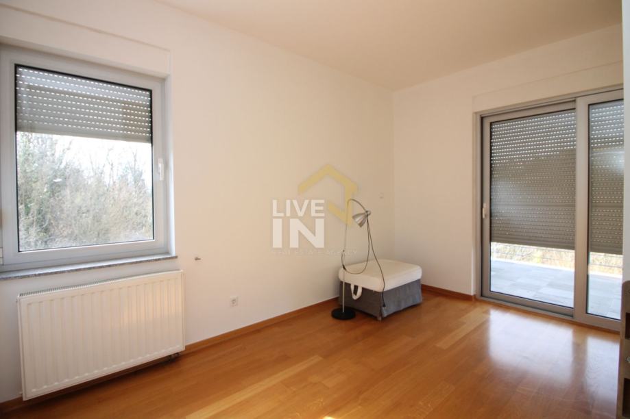 Zgrada je izgrađena 2007. godine, stan se nalazi na 1. katu (polukat - ispod još 2 etaže), orijentacije zapad i djelomično jug. Sastoji se od predsoblja (veliki ugrađeni ormari), gostinjskog wc-a (kod ulaza, ima prozor), kuhinje, blagovaone i boravka, dvije spavaće sobe, garderobe i velike kupaone (ima prozor) i terase po cijeloj zapadnoj fronti stana na koju se izlazi iz boravka i veće spavaće sobe. Alu stolarija (rolete na struju), plinsko etažno centralno grijanje, stan je u vrlo solidnom stanju, djelomično namješten (kuhinj, ugrađeni ormari predsoblje i ormari u garderobi). U dvorištu se nalaze 2 parkirna natkrivena mjesta, svaki obračunske površine od 6,25m2 (moguće parkirati i treće vozilo ispred vlastitih parkinga), upisani u zk, ukupno upisano cca 96m2 (obračunska kvadratura). U podrumu se nalazi spremište 12m2 (vanknjižno vlasništvo).