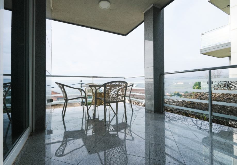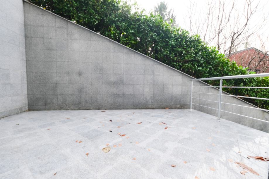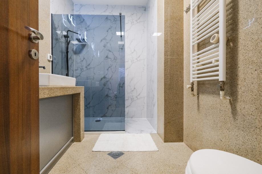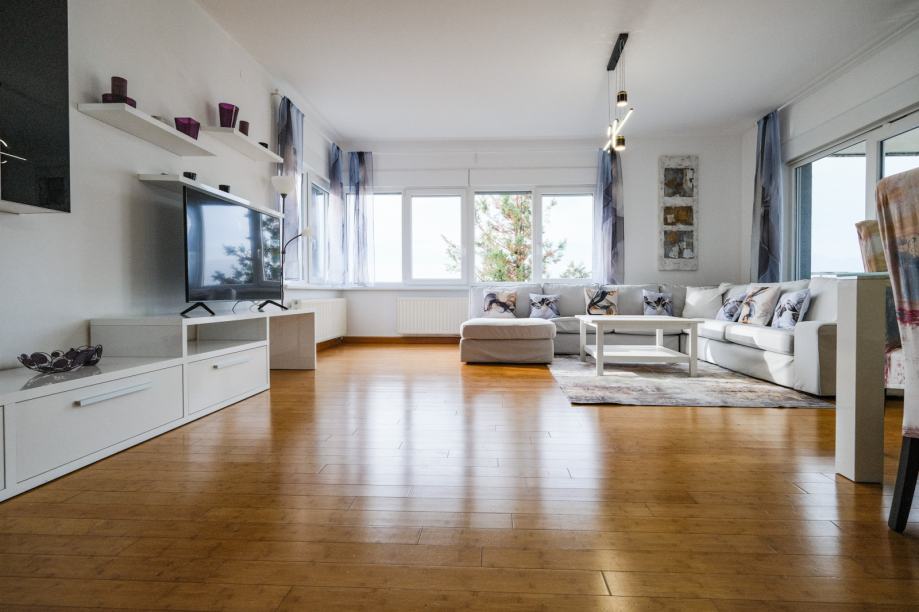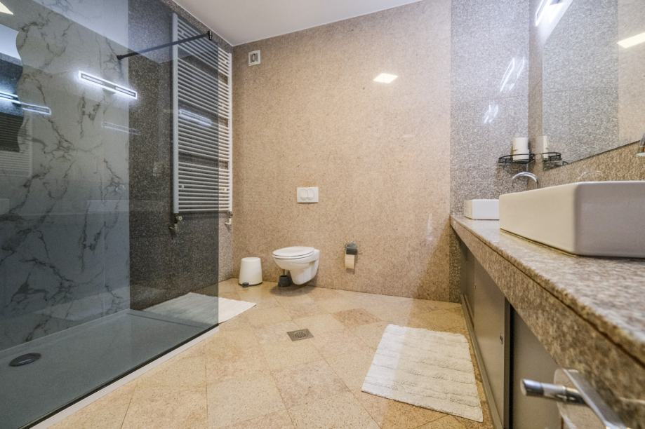 Raspored je iznimno prostran i promišljeno oblikovan. Stan ima četiri velike spavaće sobe, pri čemu svaka soba ima izlaz na vlastitu privatnu terasu, što pruža poseban osjećaj komfora i intime. Open-space dnevni boravak povezan je s blagovaonicom i kuhinjom te ima izlaz na glavnu terasu okruženu zelenilom, idealnu za opuštanje i boravak na otvorenom. U stanu se nalaze dvije kupaonice, od kojih je jedna vezana uz jednu spavaću sobu i odvojeni toalet.