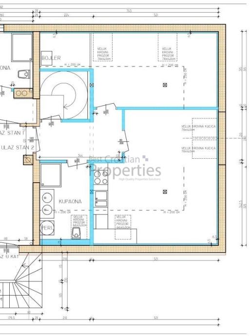 Stan se nalazi na prvom katu kuće (visoko potkrovlje), a sastoji se od ulaznog prostora, dnevnog boravka s kuhinjom i blagovaonicom, spavaće sobe i kupaonice s toaletom i tuš kabinom.