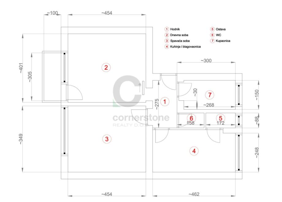 Stan se sastoji od ulaznog hodnika, kupaonice, odvojeni WC, spavaće sobe, dnevnog boravka, zatvorene lođe, kuhinje s ostavom i blagovaonicom.