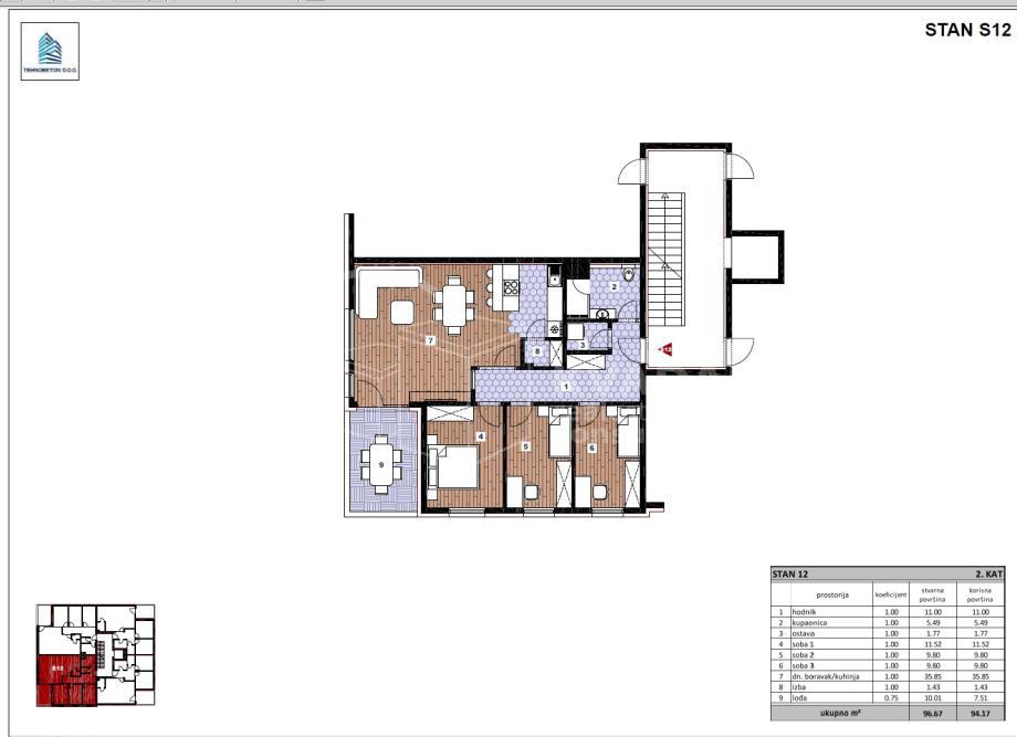 Ukupna stvarna površina stana iznosi 96,57 m2, dok obračunska površina iznosi 94,17 m2.