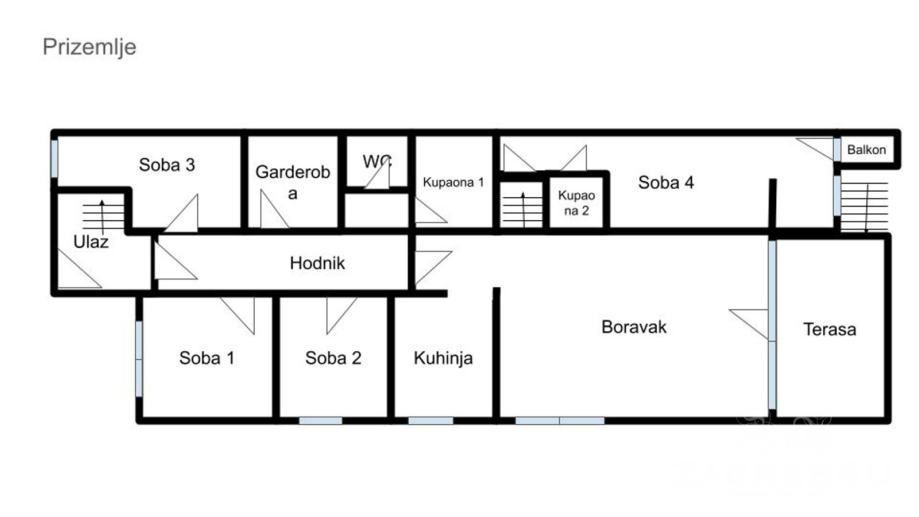 - PRIZEMLJA: 4 spavaće sobe, velikog dnevnog boravka, blagovaonice, kuhinje, male blagovanice, garderobe, 2 kupaonice s WC-ima i tuševima i jednog dodatnog WC-a, balkona, terase i izlaza na dvorište