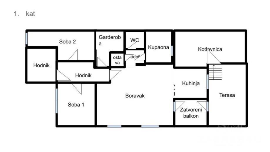 - 1. KATA: 2 spavaće sobe, velikog boravka, blagovanice, kuhinje, garderobe, jedne kupaonice s WC-om i kadom, jednog dodatnog WC-a i velike terase.