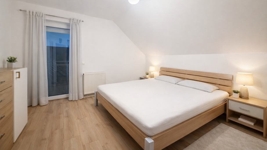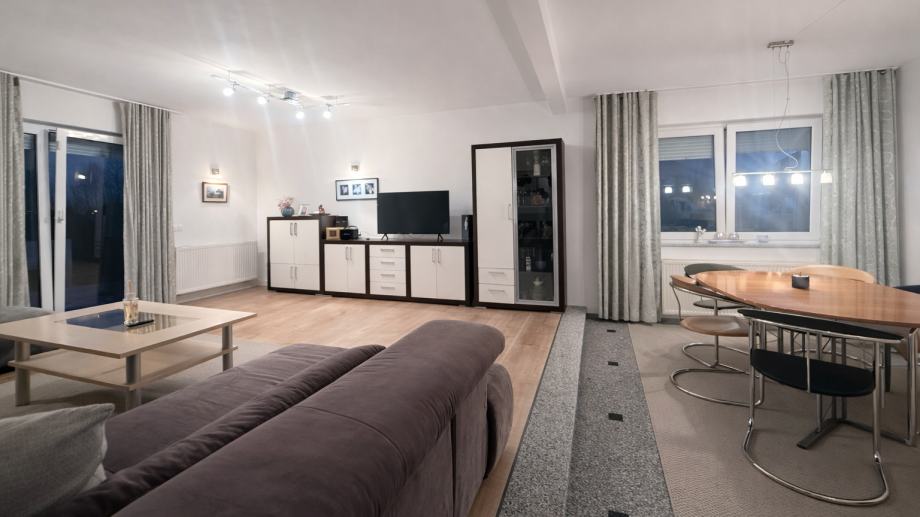 Nekretnina se sastoji od 3 spavaće sobe, prostranog dnevnog boravka povezanog s blagovaonicom i kuhinjom u modernom open-space konceptu, kupaonice te dodatnih funkcionalnih prostorija koje osiguravaju maksimalnu udobnost i praktičnost. Dvije spavaće sobe imaju izlaz na balkon, što dodatno doprinosi osjećaju komfora i privatnosti.