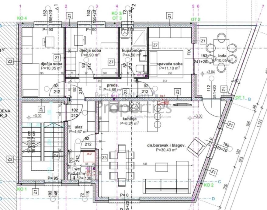Predmetni stan se sastoji od ulaznog hodnika (4.67m2), predsoblja (4.65m2), dnevnog boravka s blagovaonicom (30,43m2), dvije prostrane spavaće sobe 1 (11,10 m2), spavaće sobe 2 (10.05 m2), te jedne manje sobe (8.90m2), kupaonice (4,60 m2), dodatnog wc-a (2,48 m2) i loggie 10.05m2.