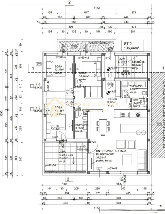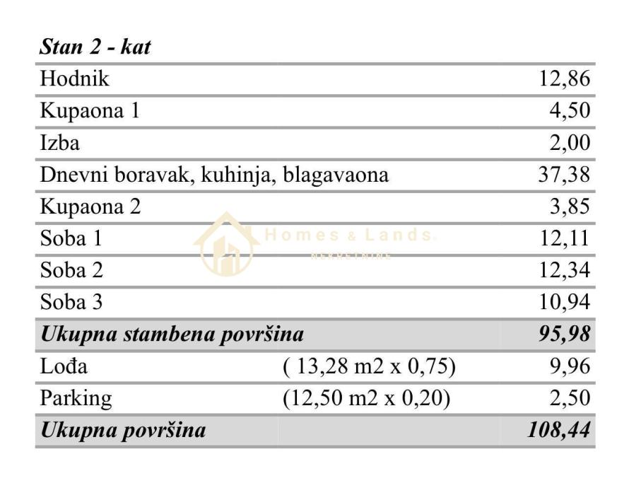 Površina stana: 108,44 m²Kat: 1 katDodatno: Vanjsko parkirno mjesto