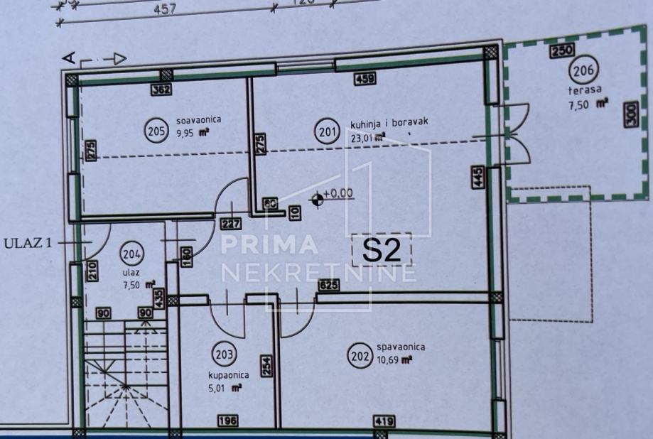Stan 2 na prvom katu sastoji se od hodnika, dnevnog boravka, kuhinje s blagovonicom, wc-a, spavaće sobe, balkona koji gleda na dvorišnu stranu.