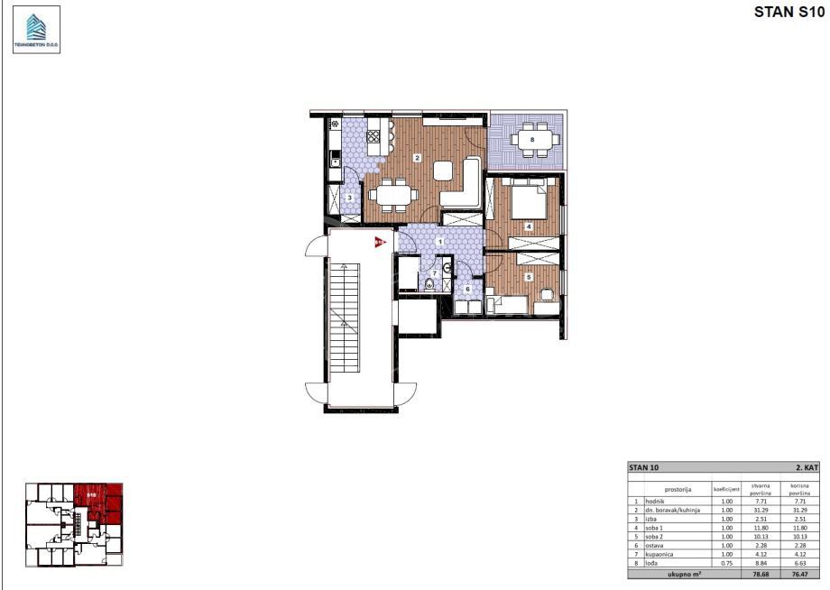 Ukupna stvarna površina stana iznosi 78,68 m2, dok obračunska površina iznosi 76,47 m2.