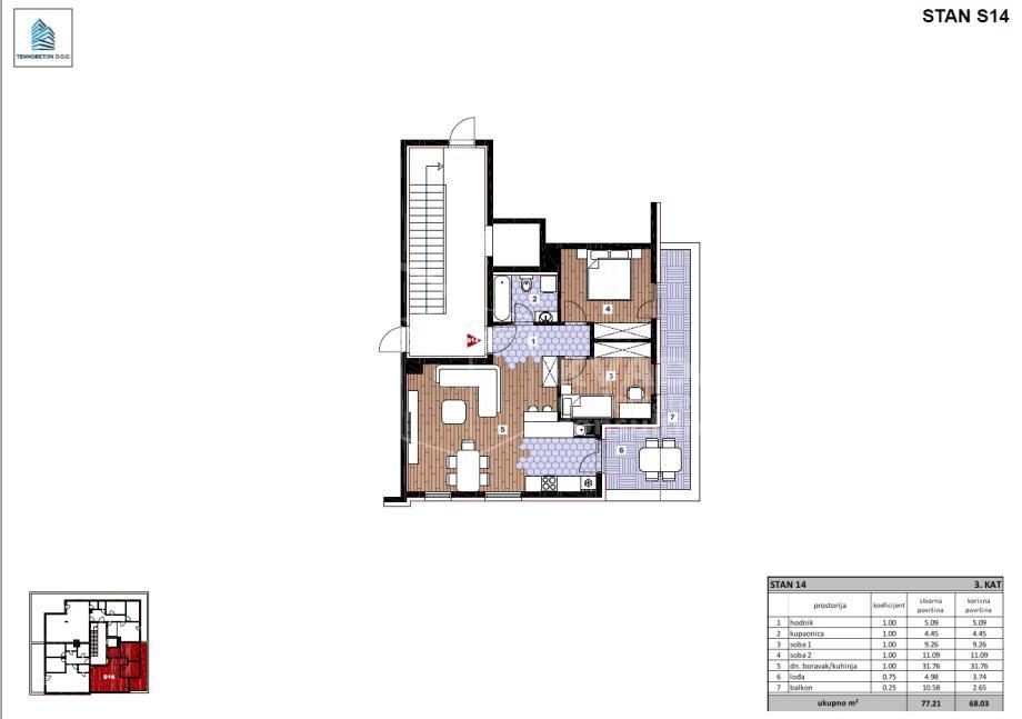 Ukupna stvarna površina stana iznosi 77,21 m2, dok obračunska površina iznosi 68,03 m2.