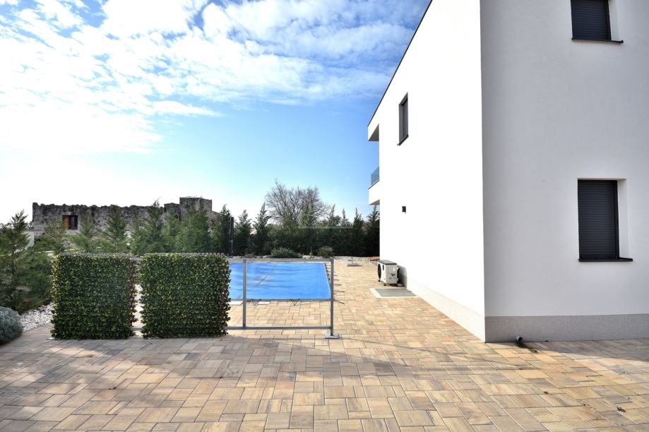 Okućnicu kuće čini vrt koji je kultiviran mediteranskim biljem , dvorište s dva parkirna mjesta i bazen površine 25m2.