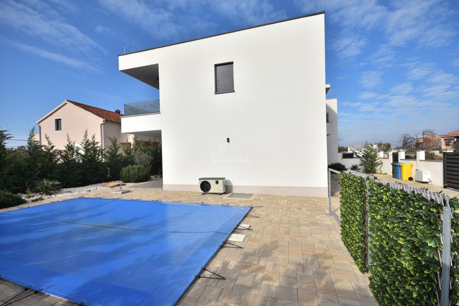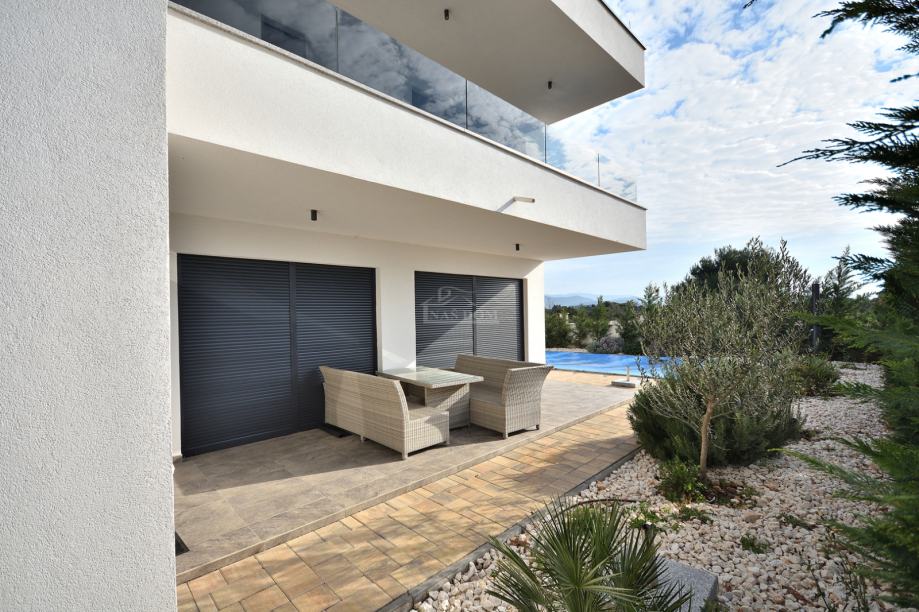 Šibenik, Martinska- prodaje se luksuzna nekretnina s bazenom na mirnoj lokaciji u mjestu Bogdanovići , u blizini Jadrije i Šibenika. Kuća , u naravi dvojni objekt ukupne neto korisne vrijednosti površine 190,39 m2 sastoji se od dvije etaže : Prizemlje +kat . Kuća modernog izgleda izgradena je kvalitetnim materijalima i opremljena prema posljednjem standardu gradnje : protuprovalna ulazna aluminijska vrata, Pvc stolarija s komarnicima, klizne staklene stijene, podno grijanje u kuponicama, moderne kupaonske sanitarije, INVERETER klime u spavaćim sobama i dnevnom boravku ...