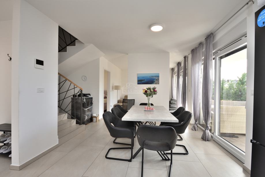 Kuća ima rani krov te postoji mogućnost korištenja istog kao krovne terase od 80 m2 s koje se pruža pogled na okolicu , more i otoke , potrebno je smao instalirati kružne stepenice .