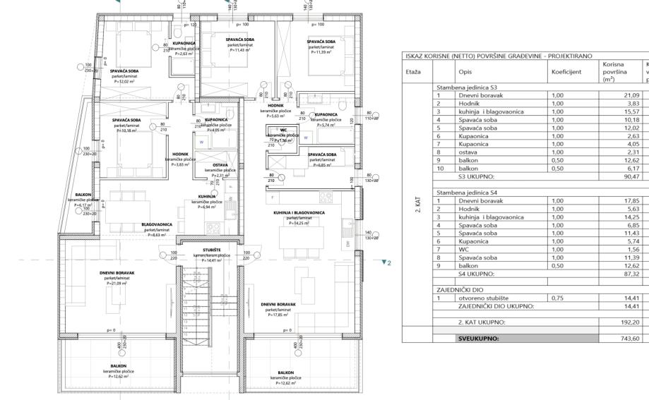 Komforan trosoban stan u na drugom katu, ukupne korisne površine 87,3 m2.Sastoji se od tri spavaće sobe, open space kuhinje s blagovaonicom i dnevnog boravka, kupaonice, gostinjskog WC-a, predsoblja i prostrane loggie ispred dnevnog boravka.Zatvorena stambena korisna površina stana je 74,7 m2,...