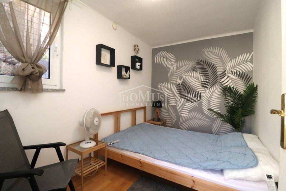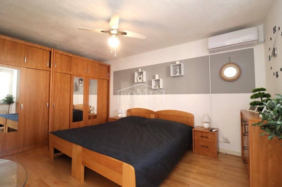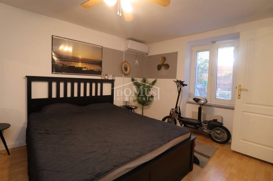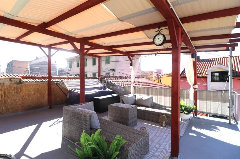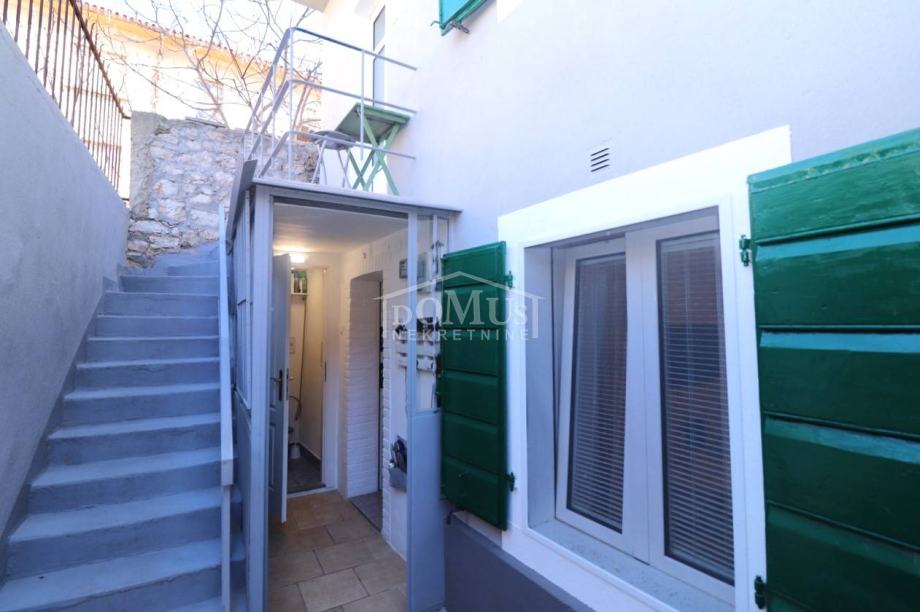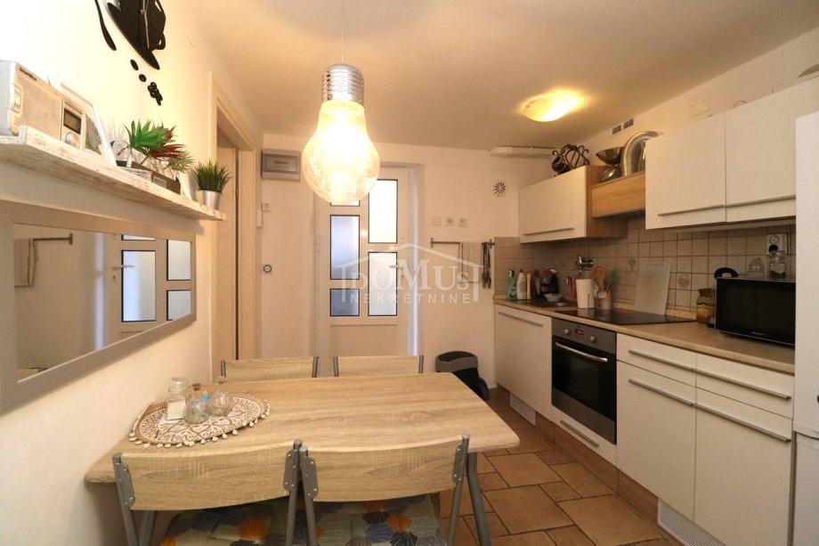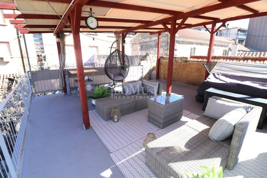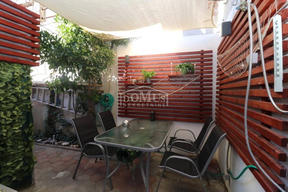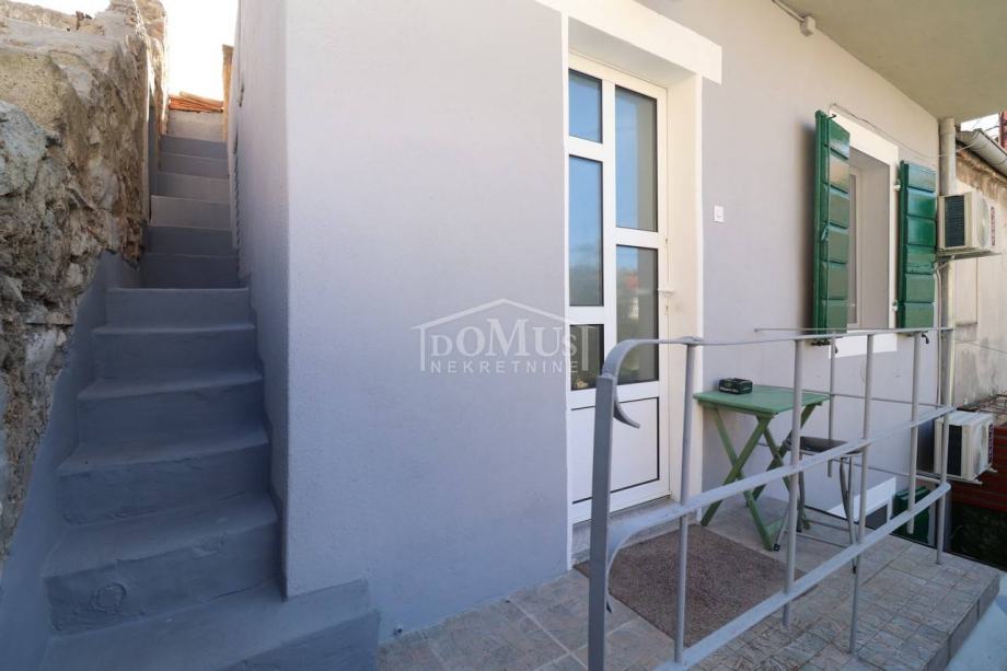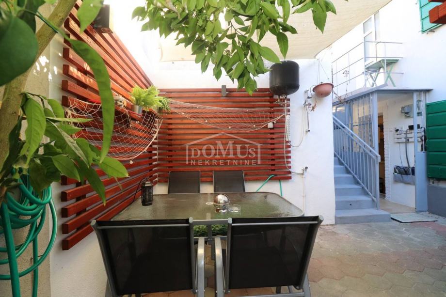 U centru grada, nalazi se kuća u nizu ukupne korisne površine 75,97 m2 (prizemlje + 1. kat + krovna terasa) sa dvorištem. Prizemlje se sastoji od ulaza, wc-a, kuhinje sa blagovaonicom, jedna spavaća soba i kupaonica. Vanjske stepenice vode na 1. kat na kojem se nalazi natkriveni ulaz, predsoblje, dvije spavaće sobe i zaseban wc. Vanjske stepenice vode na krovnu terasu površine 32,70m2. U dvorištu se nalazi roštilj i vrtna garnitura za sjedenje. Kuća je komplet namještena i useljiva, a veći dio namještaja ulazi u cijenu nekretnine. Nekretnina ima pristup osobnim vozilom, a parking je na javnoj površini udaljeno 10 m. Udaljenost do mora je samo 400m. Kuća ima uporabnu dozvolu.