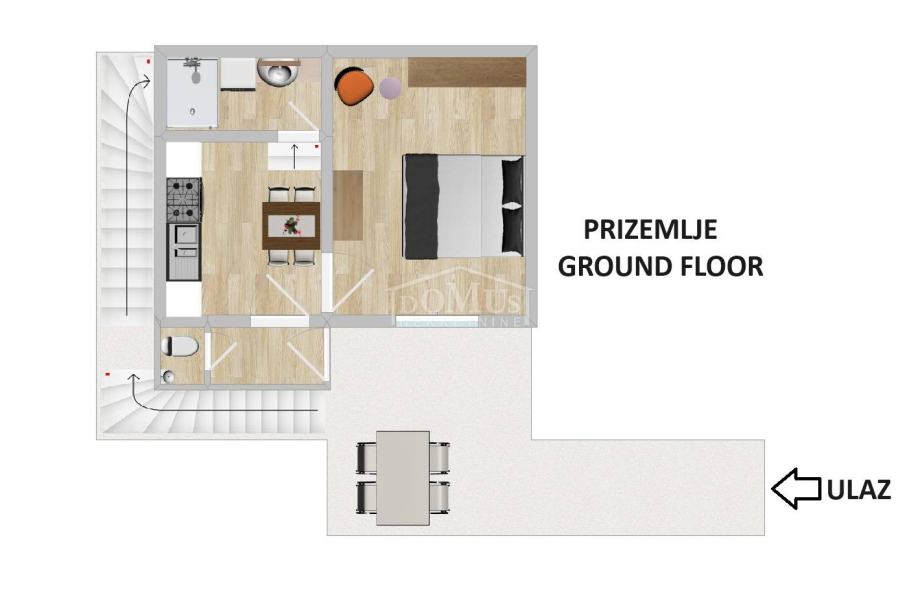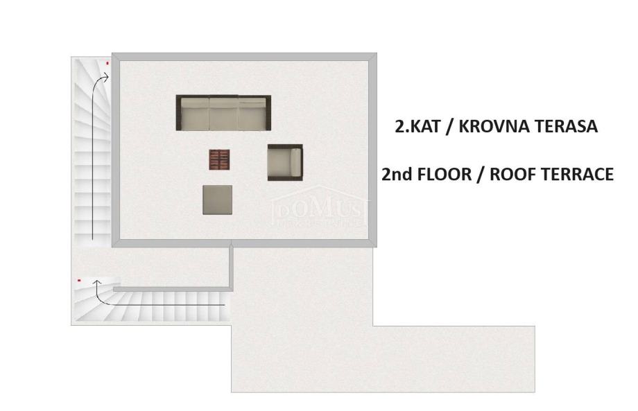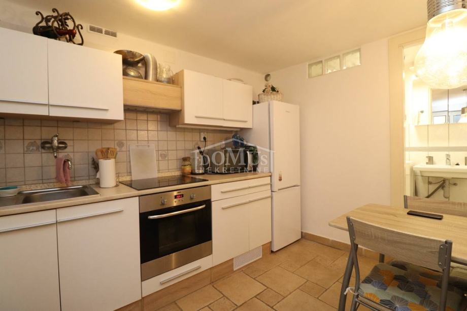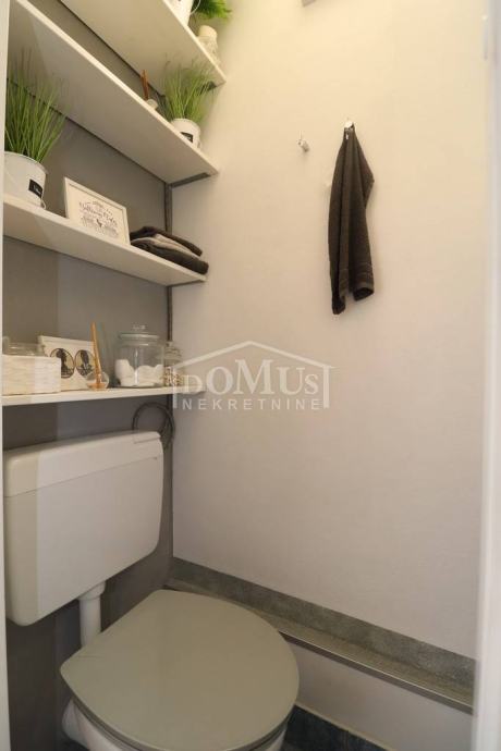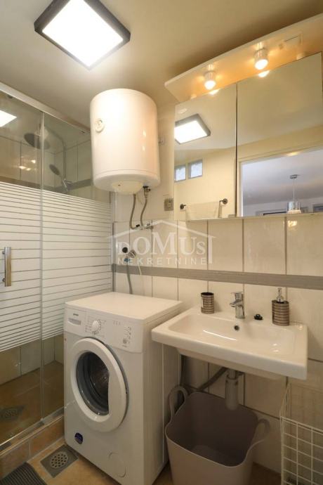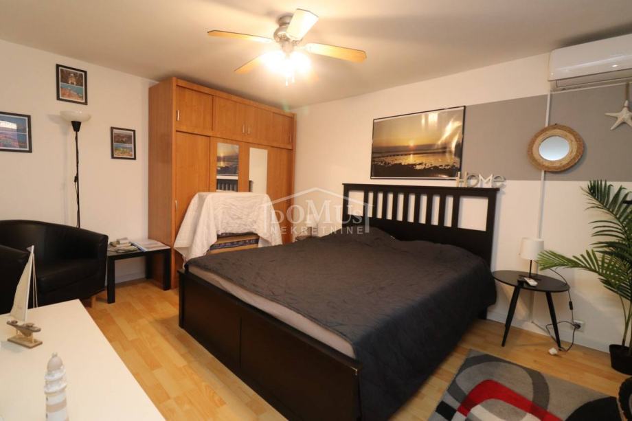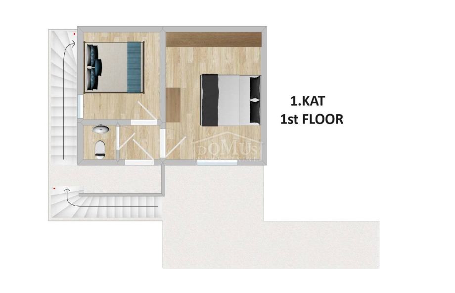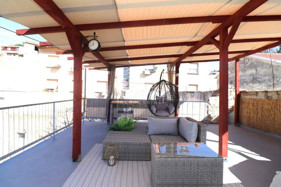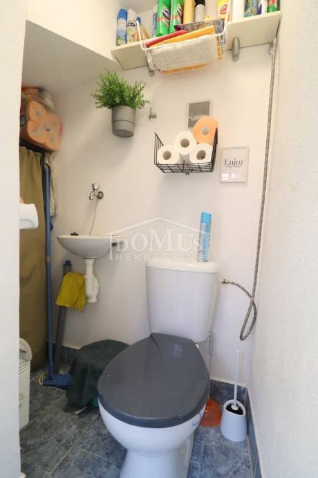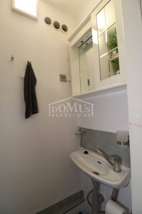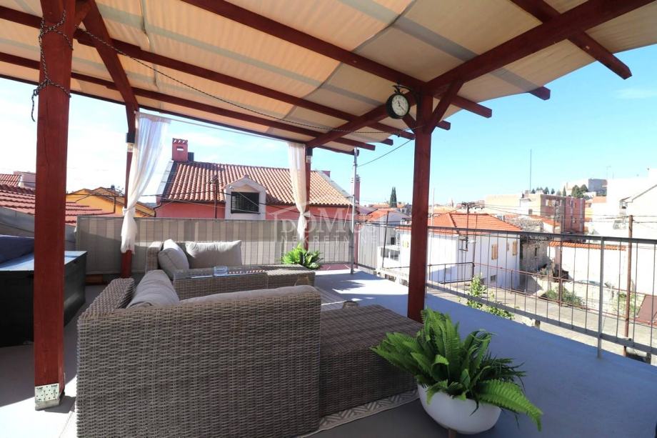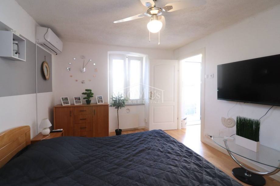 U centru grada, nalazi se kuća u nizu ukupne korisne površine 75,97 m2 (prizemlje + 1. kat + krovna terasa) sa dvorištem. Prizemlje se sastoji od ulaza, wc-a, kuhinje sa blagovaonicom, jedna spavaća soba i kupaonica. Vanjske stepenice vode na 1. kat na kojem se nalazi natkriveni ulaz, predsoblje, dvije spavaće sobe i zaseban wc. Vanjske stepenice vode na krovnu terasu površine 32,70m2. U dvorištu se nalazi roštilj i vrtna garnitura za sjedenje. Kuća je komplet namještena i useljiva, a veći dio namještaja ulazi u cijenu nekretnine. Nekretnina ima pristup osobnim vozilom, a parking je na javnoj površini udaljeno 10 m. Udaljenost do mora je samo 400m. Kuća ima uporabnu dozvolu.
