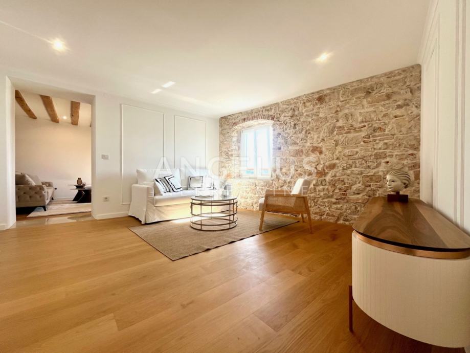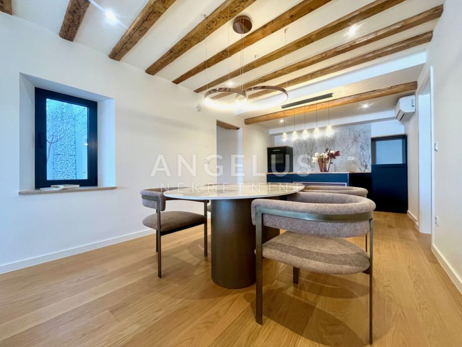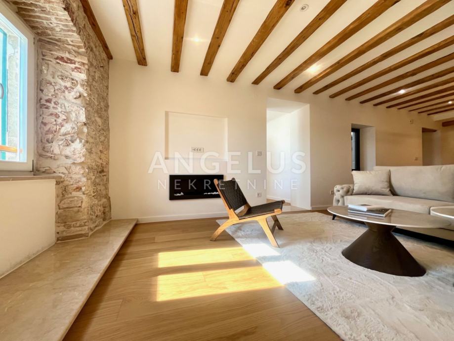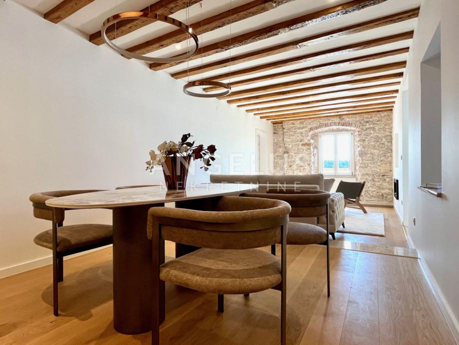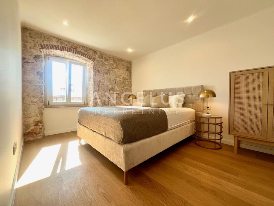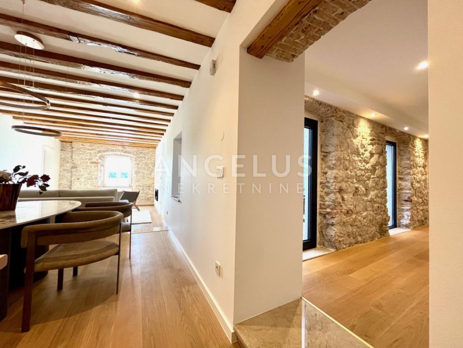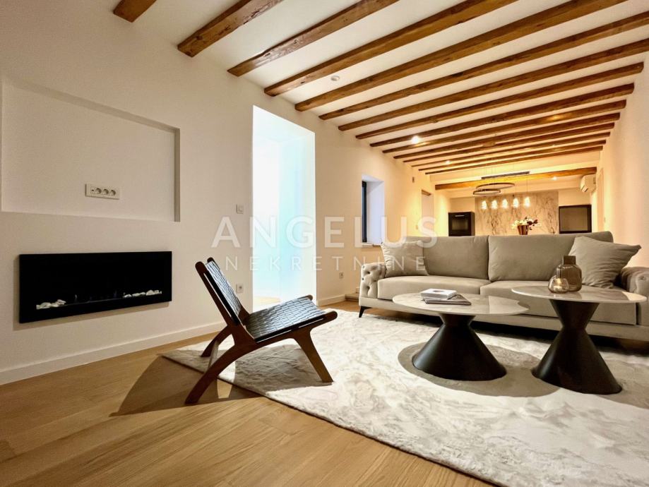 Predivan luksuzni stan cca NKP 150m2 kompletno je adaptiran, adaptacija je bila opsežna tako da su promjenjene sve instalacija u stanu, novi podovi napravljeni, kamen zaštićen, grede također, promjenjena je vanjska stolarija i škure, izvedeno sve najnovijim tehnologijama i opremljen visokokvalitetnim materijalima.