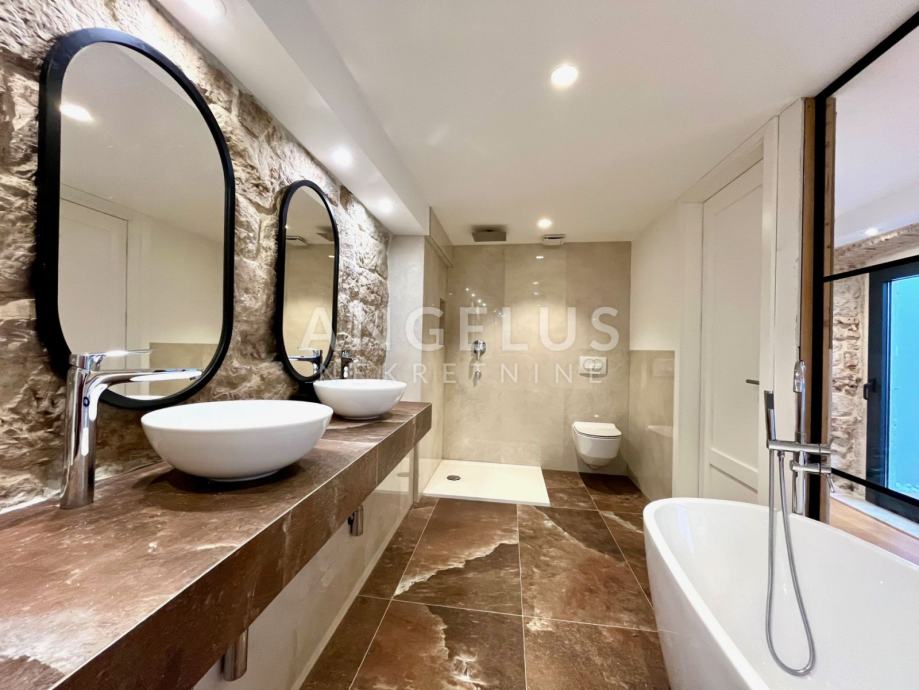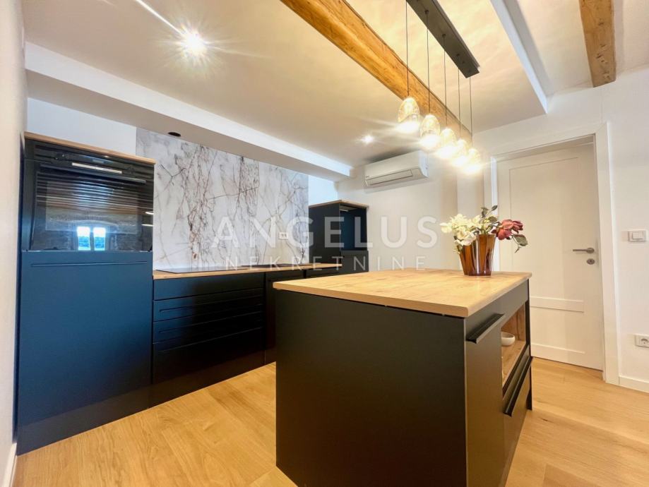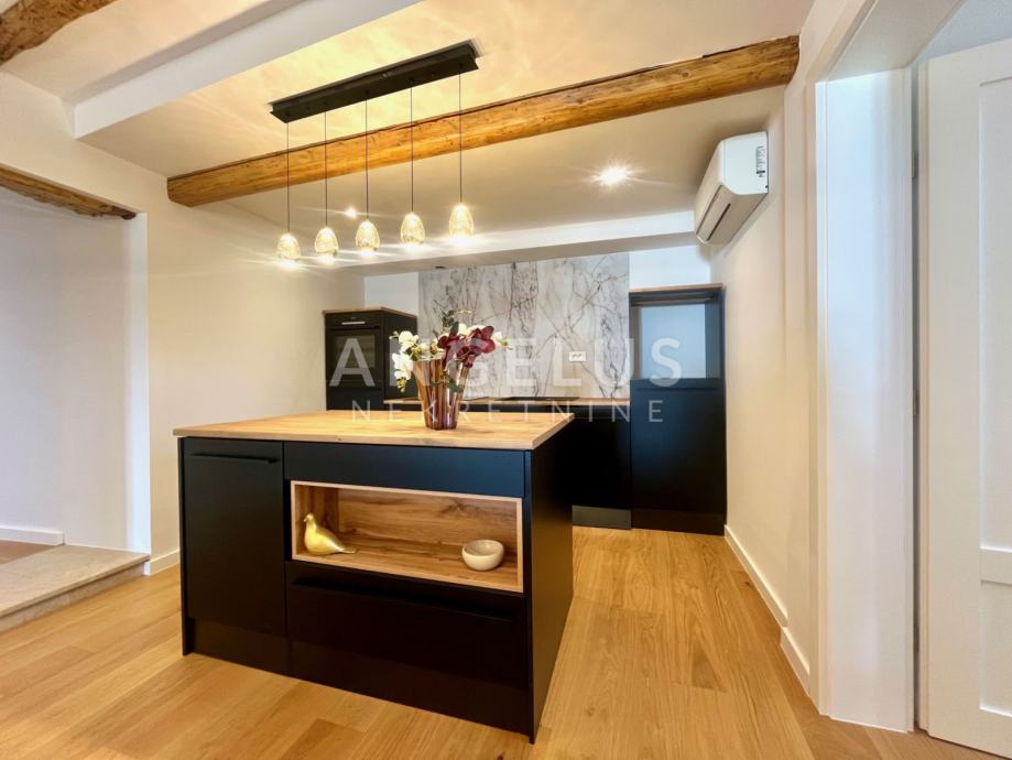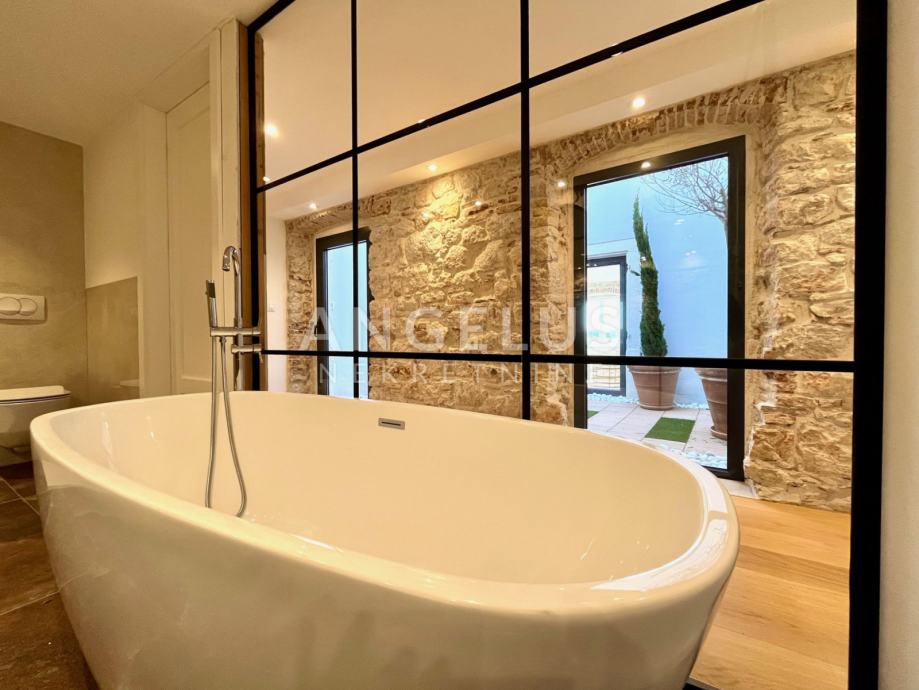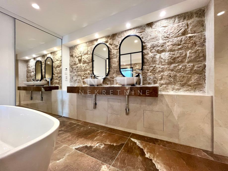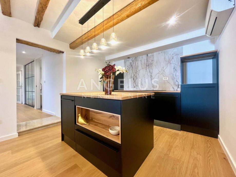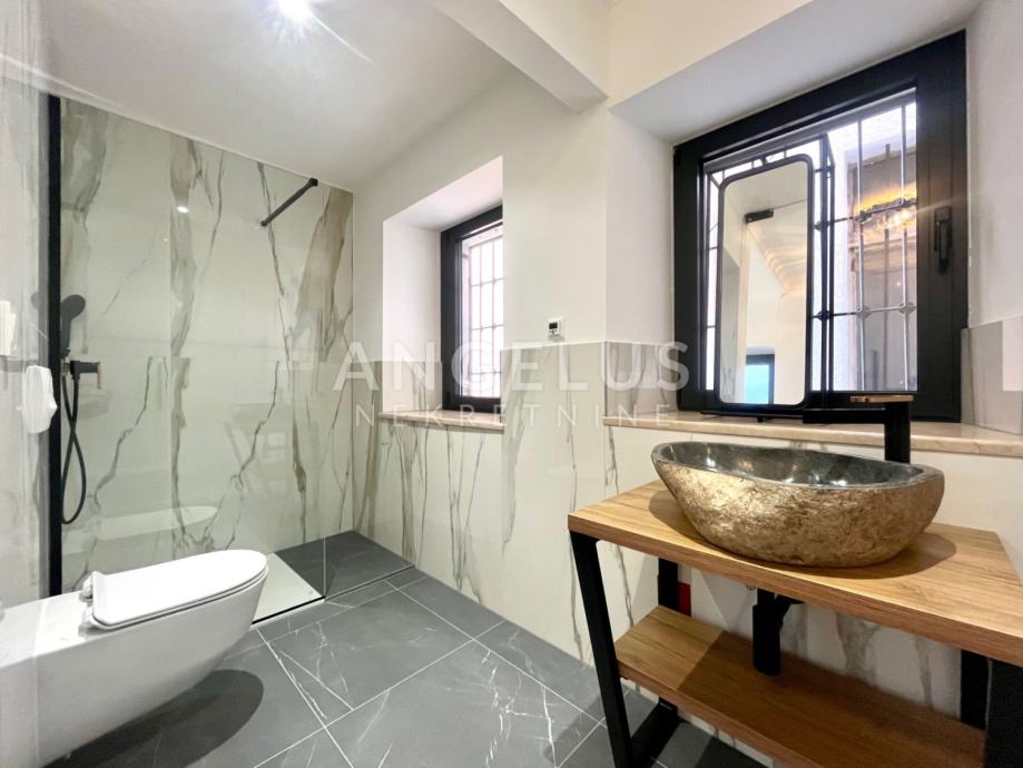 Predivan luksuzni stan cca NKP 150m2 kompletno je adaptiran, adaptacija je bila opsežna tako da su promjenjene sve instalacija u stanu, novi podovi napravljeni, kamen zaštićen, grede također, promjenjena je vanjska stolarija i škure, izvedeno sve najnovijim tehnologijama i opremljen visokokvalitetnim materijalima.