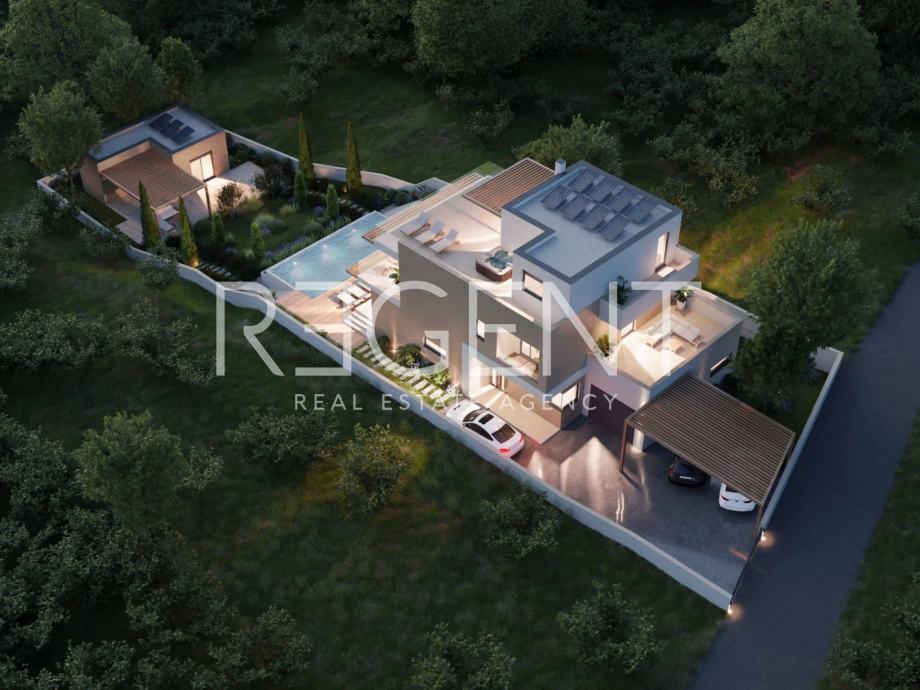 Posredujemo pri prodaji vile u izgradnji u mirnom dijelu naselja Dvornice, nedaleko od Rogoznice. Vila je u potpunosti okružena prirodom i nudi predivan pogled na more i otoke. Smještena je na parceli ukupne površine od 948 m2, dok joj stambena površina iznosi 450 m2. Uključuje prizemlje, prvi kat, drugi kat te pomoćnu zgradu s bazenom, ljetnom terasom i mediteranskim vrtom.U prizemlju se nalazi prostrani dnevni boravak s blagovaonicom i modernom kuhinjom veličine 49m2, spremište, hodnik, praonica rublja, spavaća soba površine 13m2 i kupaonicu. Vanjski dio prizemlja uključuje terasu koja je dijelom natkrivena te sadrži dio za sunčalište i preljevni bazen veličine 42m2.Na prvom katu vile smještena su tri spavaće sobe od kojih svaka ima vlastitu modernu kupaonicu, hodnik, spremište, terasa od 25m2 s pogledom na more koja je dijelom natkrivena i pruža ulaz iz dvije spavaće sobe, terasu od 30m2 koja je također dijelom natrkivena te lođu koja se nalazi u trećoj spavaćoj sobi. Ukupna površina prvog kata zajedno s terasama je 144,72m2.Na drugom katu nalazi se master spavaća soba s površinom od 15m2 koja uključuje hidromasažnu kadu, toalet za dodatnu udobnost i projekcijska soba s najmodernijom video i zvučnom tehnologijom koja može poslužiti u zabavne ili poslovne svrhe. Vanjski dio uključuje nenatrkivenu terasa od 8m2, prostranu nenatrkivena terasa od 65m2 koja sadrži prostor za druženje i sunčanje, jacuzzi i ljetni šank. Cjelokupna površina drugog kata zajedno s terasama je 110m2.Ispod područja bazena nalazi se pomoćna zgrada i veliki mediteranski vrt koji daje dodatan dizajn i raskoš ovoj vili. Unutar pomoćne zgrade smještena je teretana, sauna, garderoba i toalet. Na vanjskom dijelu nalazi se ljetna terasa s roštiljem koja je uz mnoštvo prirodnog zaklona također natrkivena modernom pergolom.Nadalje, za vozila je osigurana garaža s punjačem te prostorom za ostavljanje potrebština, ali i također dva vanjska natkrivena parking mjesta za dodatna vozila. Cjelokupno područje vile je pokriveno videonadzorom, a sam rad unutar vile bazira se na smart tehnologiji osiguravajući lagodan boravak te kontrolu cjelokupnog rada vile.Predstavljena nekretnina je ogledan primjer modernog dizajna koja uspješno i skladno spaja mediteransko življenje s luksuzom.Kontaktirajte nas već danas za više informacija!Za više informacija, kontaktirajte našeg agenta na brojeve telefona: