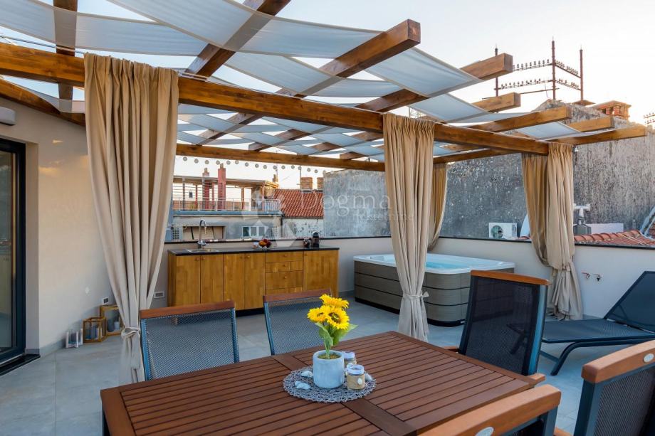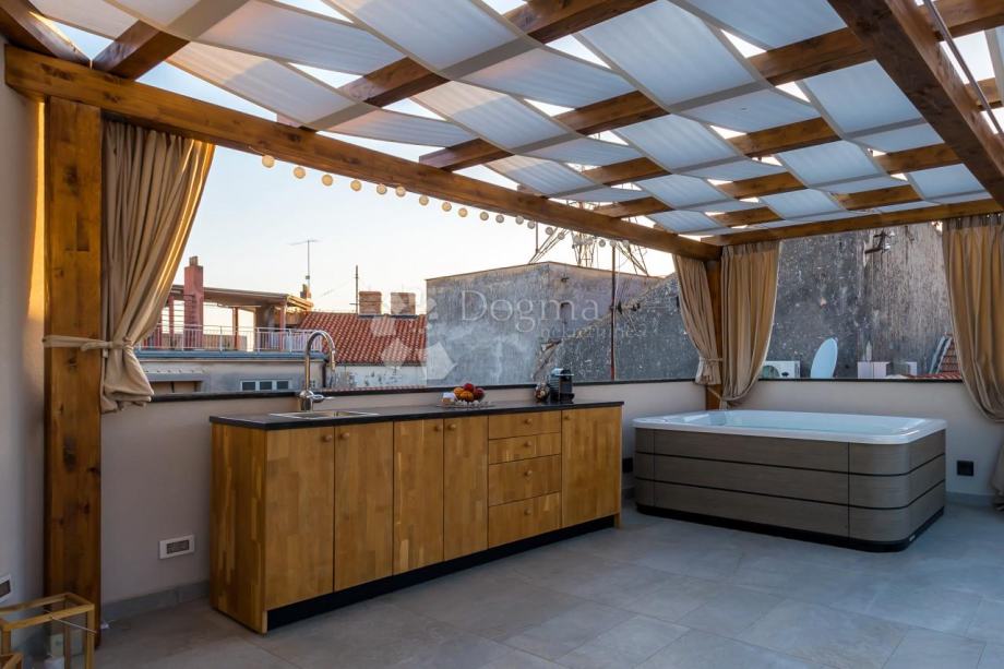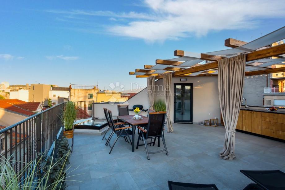 Ova terasa je kruna svega jer pruža predivan pogled na more i grad, a opremljena je ljetnom kuhinjom, jacuzzijem i prostorom za opuštanje, stvorena je i idealna za uživanje.