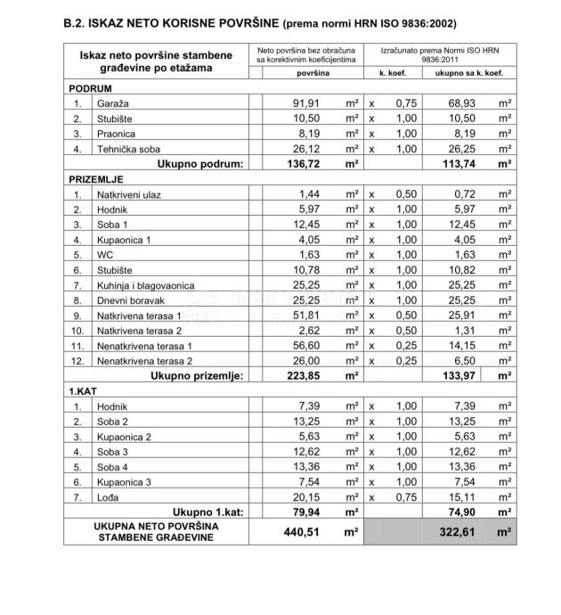 Podovi svih prostora u prizemlju i kupaonica na katu bit će obloženi podnim porculanskim pločicama I klase deb. 0,8mm ili 10mm lijepljenim na podlogu. Kupaonica će biti odijeljena od ostalih prostorija utopljenim mat inox L profilom. Ostali podovi kata (hodnik i sobe) bit će obloženi troslojnim parketom I klase.