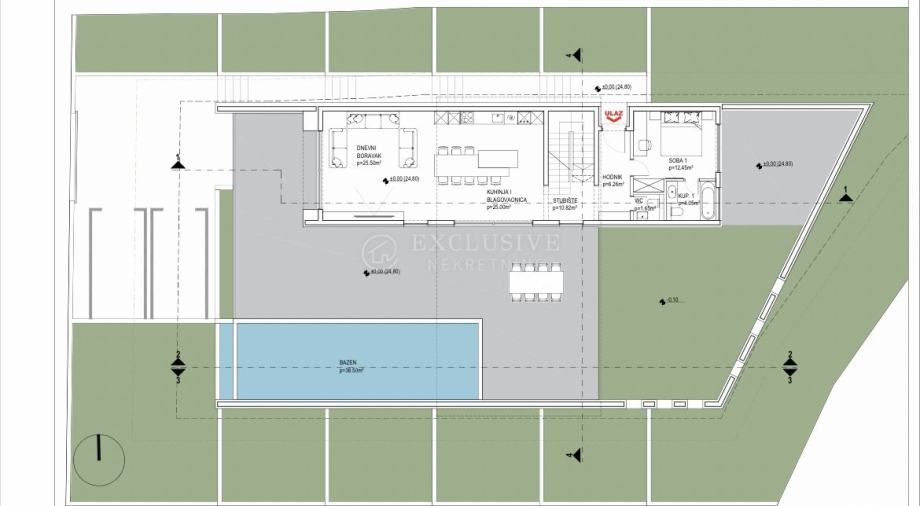 Iz dnevnog boravka pristupa se nenatkrivenoj terasi-sunčalištu, sjeverno od bazena.