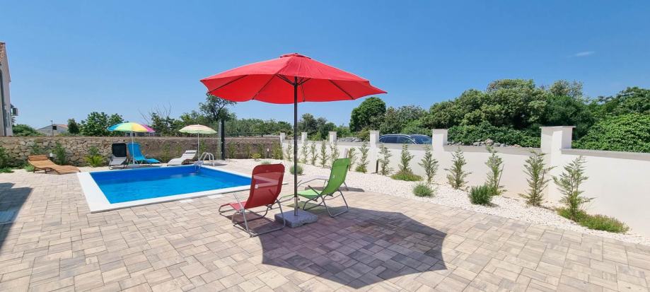 U dvorištu kuće dominira bazen i lijepo uređena okućnica hortikulturom i mediteranskim biljem dok je s druge strane predviđen prostor za dva parkirna mjesta. Kuća je u procesu gradnje, radi se prema najvišim standardima i okvirni završetak radova je kraj 2022. godine.