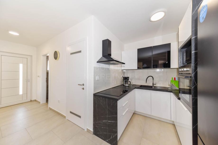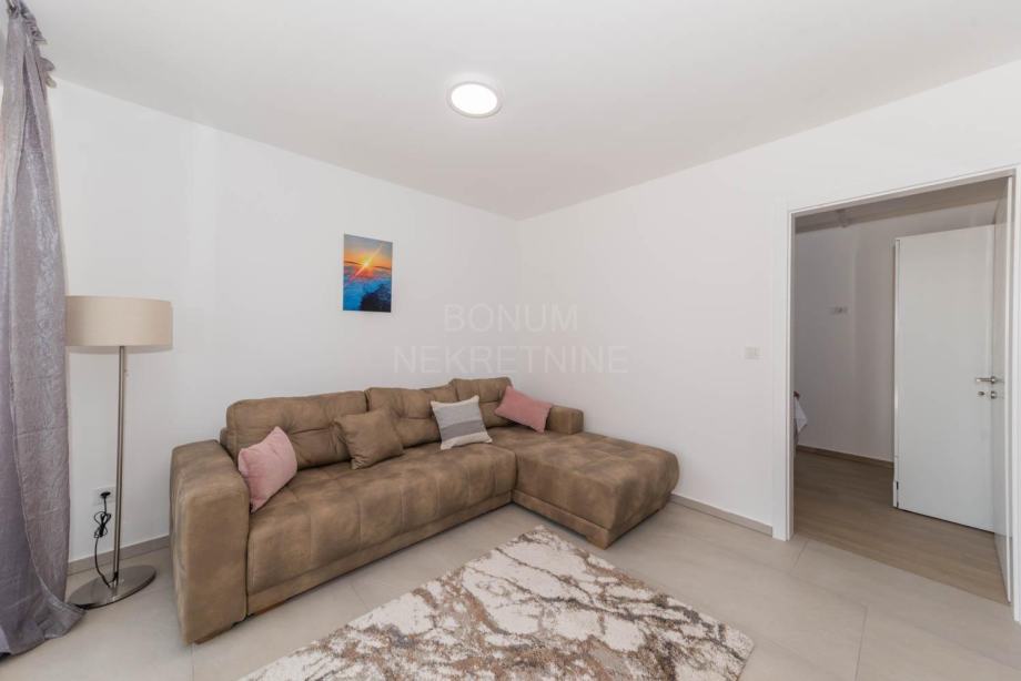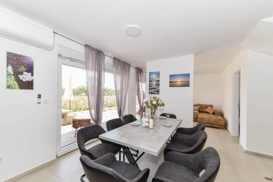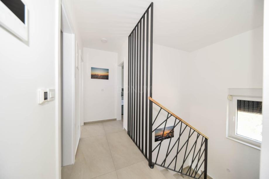 U prizemlju kuće se nalazi ulazni hodnik iz kojeg se dolazi do velikog dnevnog boravka otvorenog tipa s kuhinjom i blagovaonicom u jednoj cjelini iz kojeg se izlazi na natkrivenu terasu i dvorišni dio kuće koji s vanjske strane ima ljetnu kuhinju, zatim kupaonica, spremište i jedna spavaća soba. Unutrašnjim stepenicama se dolazi na kat kuće u kojem se nalaze još tri komforne spavaće sobe, od kojih jedna ima vlastitu kupaonicu i garderobni dio, zatim još jedna kupaonica. Iz spavaćih soba se izlazi na natkrivenu terasu 21,42 m2 dok nenatkriveni dio terase ima 3 m2.