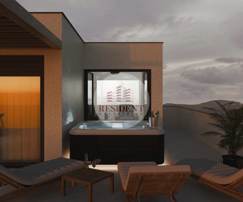 - 2. kata na kojem se nalazi glavna spavaća soba s kupaonicom koja uključuje hidromasažnu kadu, projekcijska soba s najmodernijom video i zvučnom tehnologijom. Vanjski dio uključuje dvije prostrane terase na kojima je prostor za druženje i sunčanje, jacuzzi i ljetni šank. Sa terasa se pruža predivan pogled na okolicu i predivan zalazak sunca, a sadržajno će krovna terasa sigurno biti mjesto čestog boravka i druženja. Cjelokupna površina drugog kata zajedno s terasama je 109,89 m2.